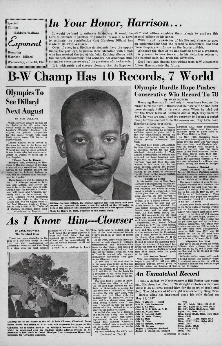 On June 16, 1948 The Exponent congratulated Harrison Dillard, a former championship athlete at BW who had won himself a place in the 100-meter competition at the Summer Olympics in London. While Dillard was a high performer in track at BW, his track career was interrupted when he was drafted into the U.S. Army. At the conclusion of World War II, Harrison found himself competing in the track team of the Mediterranean theater before returning to BW to train and work his way into the Olympics. In 1955, Dillard was awarded the Sullivan Award, recognizing him as the nation’s top amateur athlete. Dillard died on November 15 2019, but his legacy endures at his alma mater. The indoor track carries on his name, along with a bronze statue of him which can be seen outside the George Finnie Stadium.