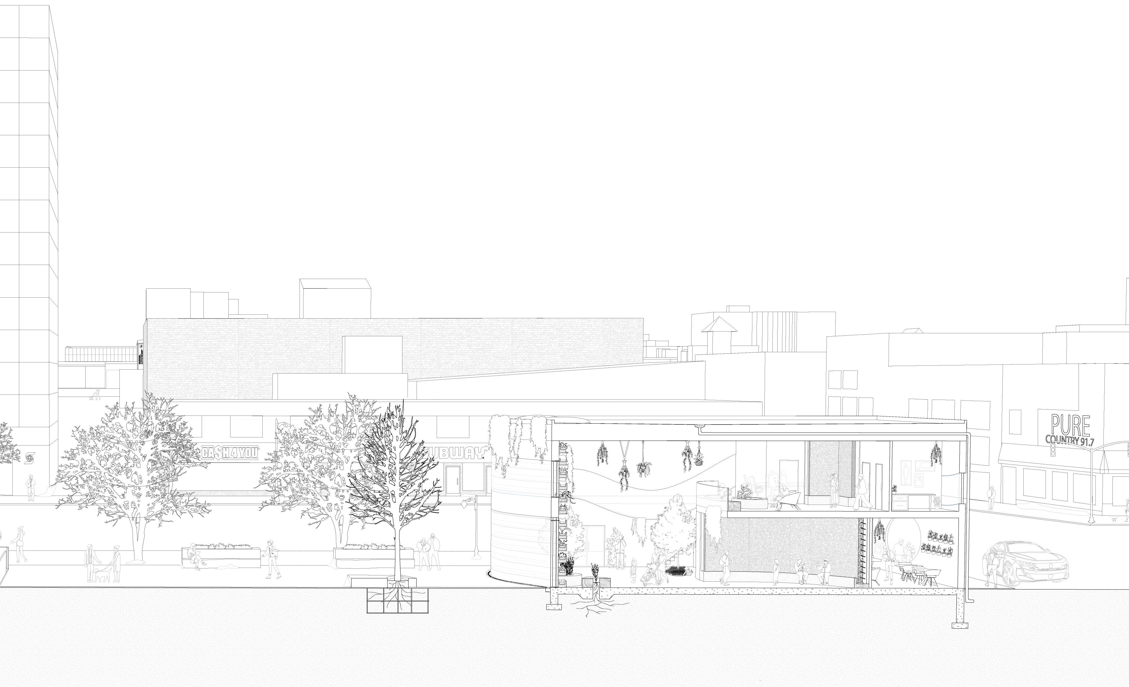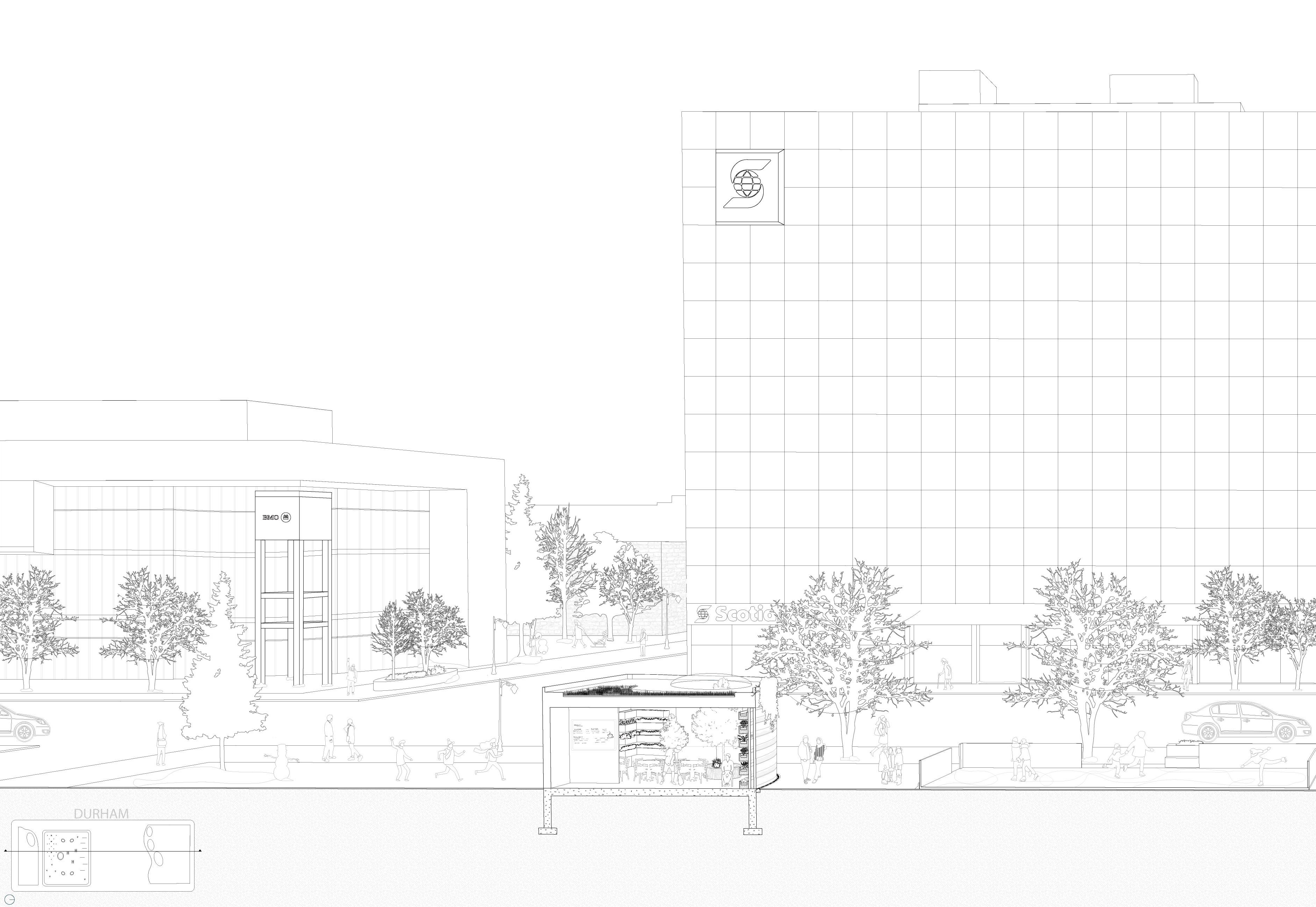 This project involved the individual design of a community space and streetscape in Downtown Sudbury, informed by the principles of the Sudbury regreening initiative within an urban framework. The proposal envisions a site that supports year-round education and growth through two anchor buildings positioned at either end of the space. These structures are designed to foster a dynamic relationship between built form and landscape, employing strategies that dissolve the threshold between interior and exterior environments during warmer seasons, creating a fluid and adaptable public realm.