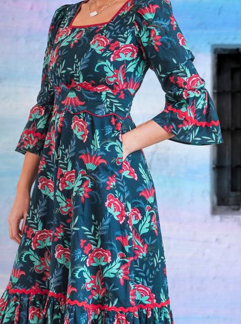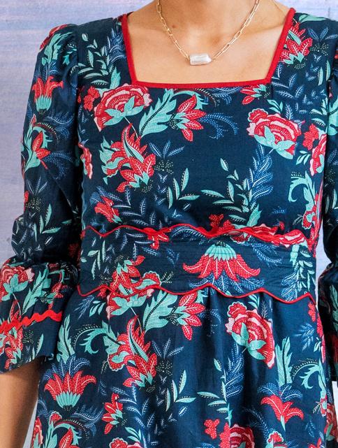Every detail adds to the ‘expensive’ feel of this gorgeous cotton, lined dress. A geometric piped neckline, quilted belt and eyecatchingly contrasting ric-rac trims.