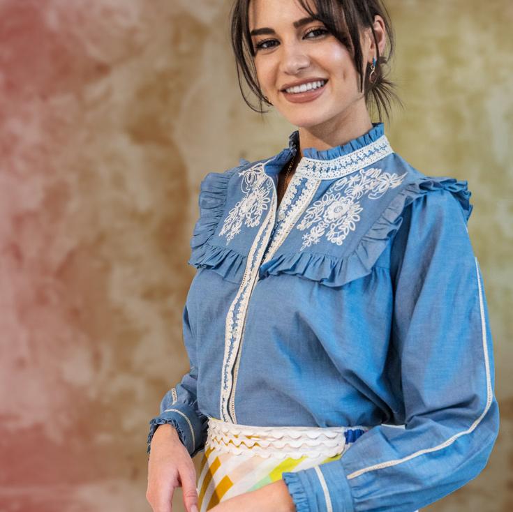 The Dakota blouse is a timeless yet fashionforward piece, crafted from organic, breathable, soft blue chambray cotton for all-day comfort. With intricate embroidery and delicate lace detailing adding a touch of elegance, while the charming frill collar enhances the vintage inspired appeal.