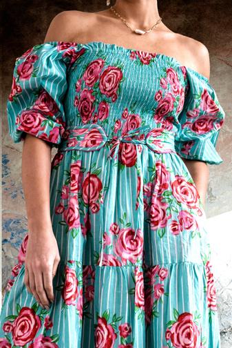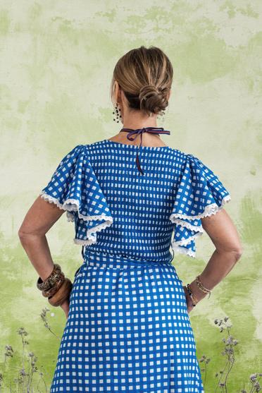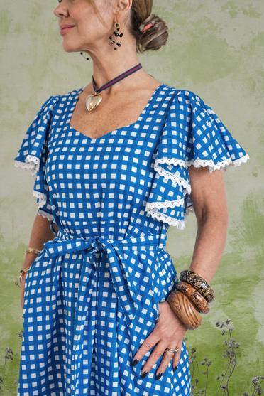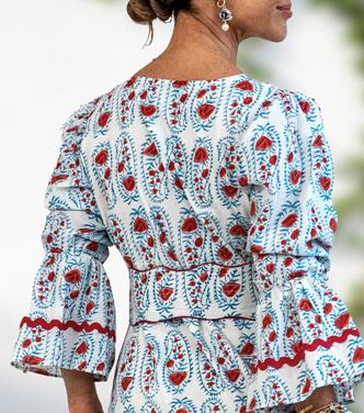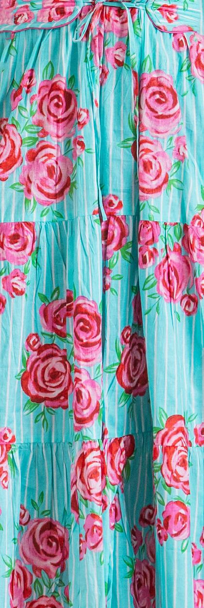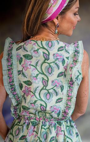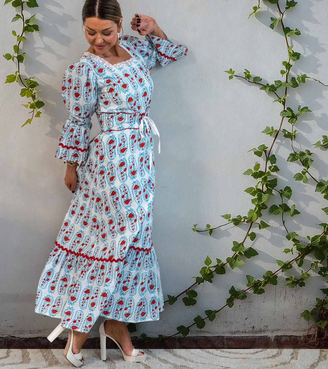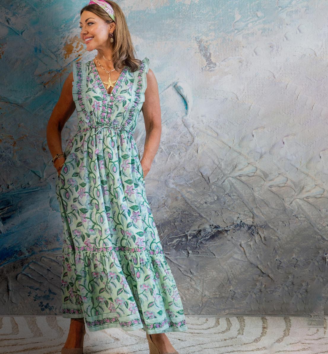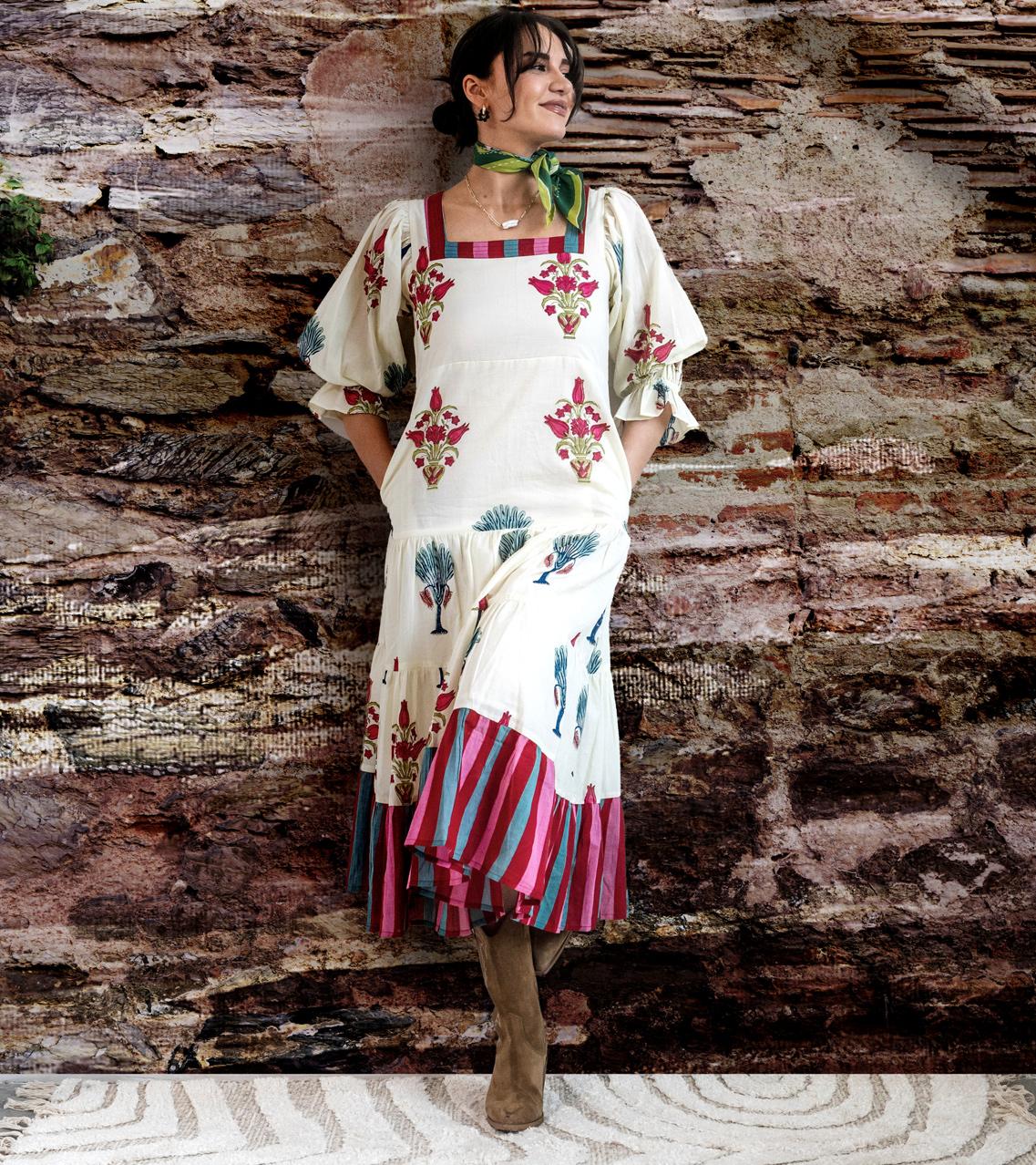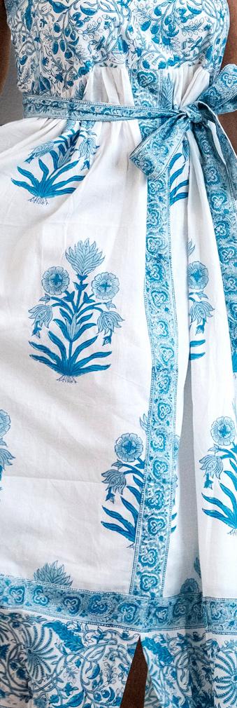 Flattering draw-string waist, button from waist to chest, cap-sleeve frill that flatters the neckline and balances the silhouette. Made of high quality organic cotton, contrast border, block printed by hand. Pockets.