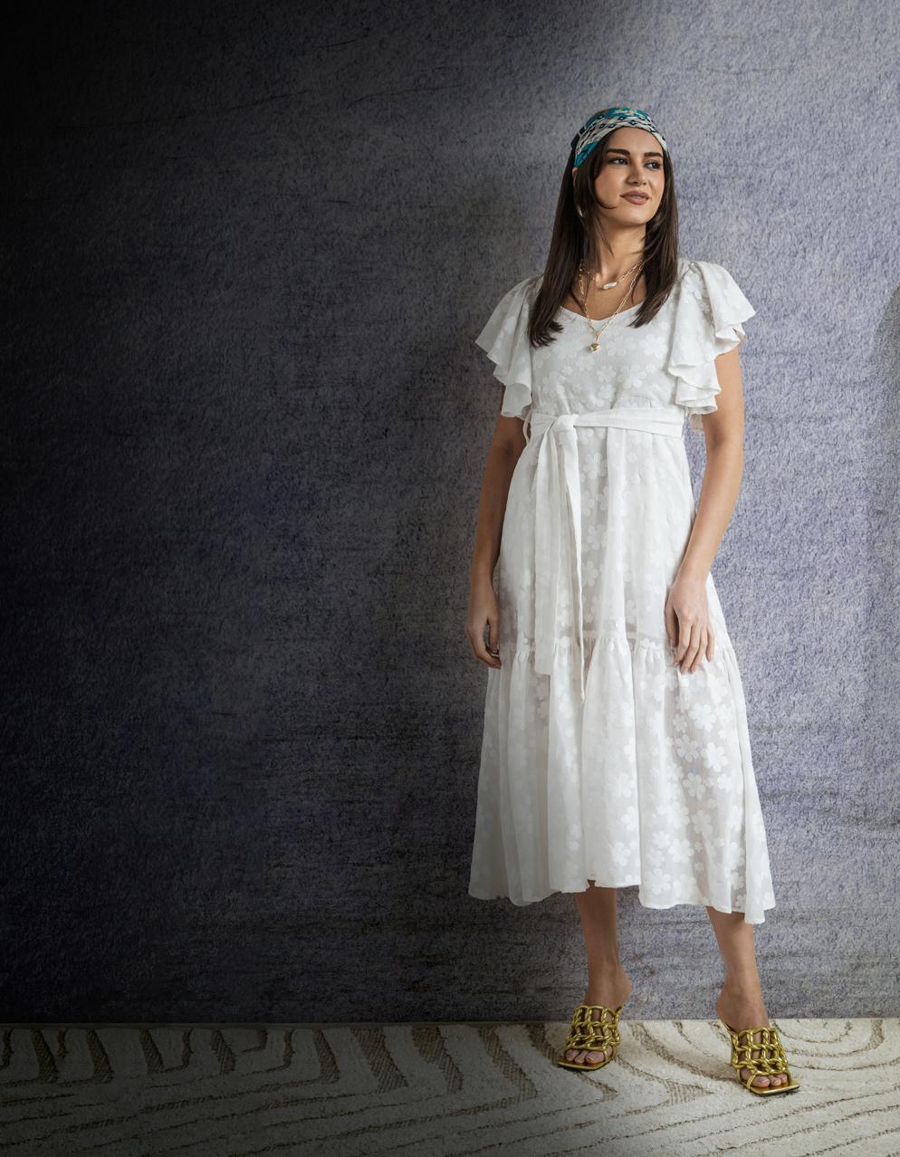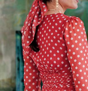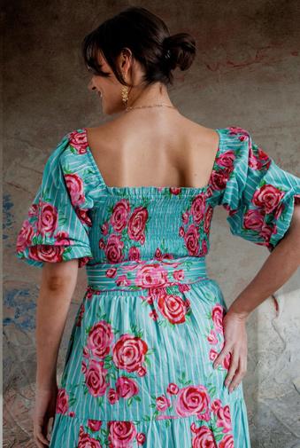A luxurious square neck softly tiered skirt and elastic bell sleeves.