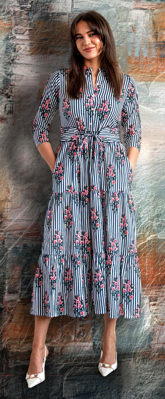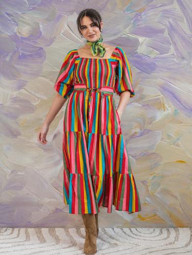 An outright classic. With its square neck and full sleeves contrasted this tiered dress with its contrast striped print. section will always turn heads .