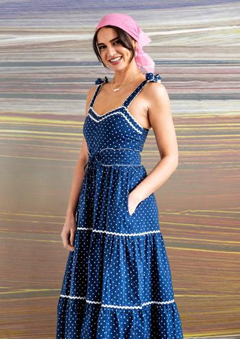 A piped Quilted belt, multi-tiered skirt with ric-rac trims and pockets. Lovingly lined.