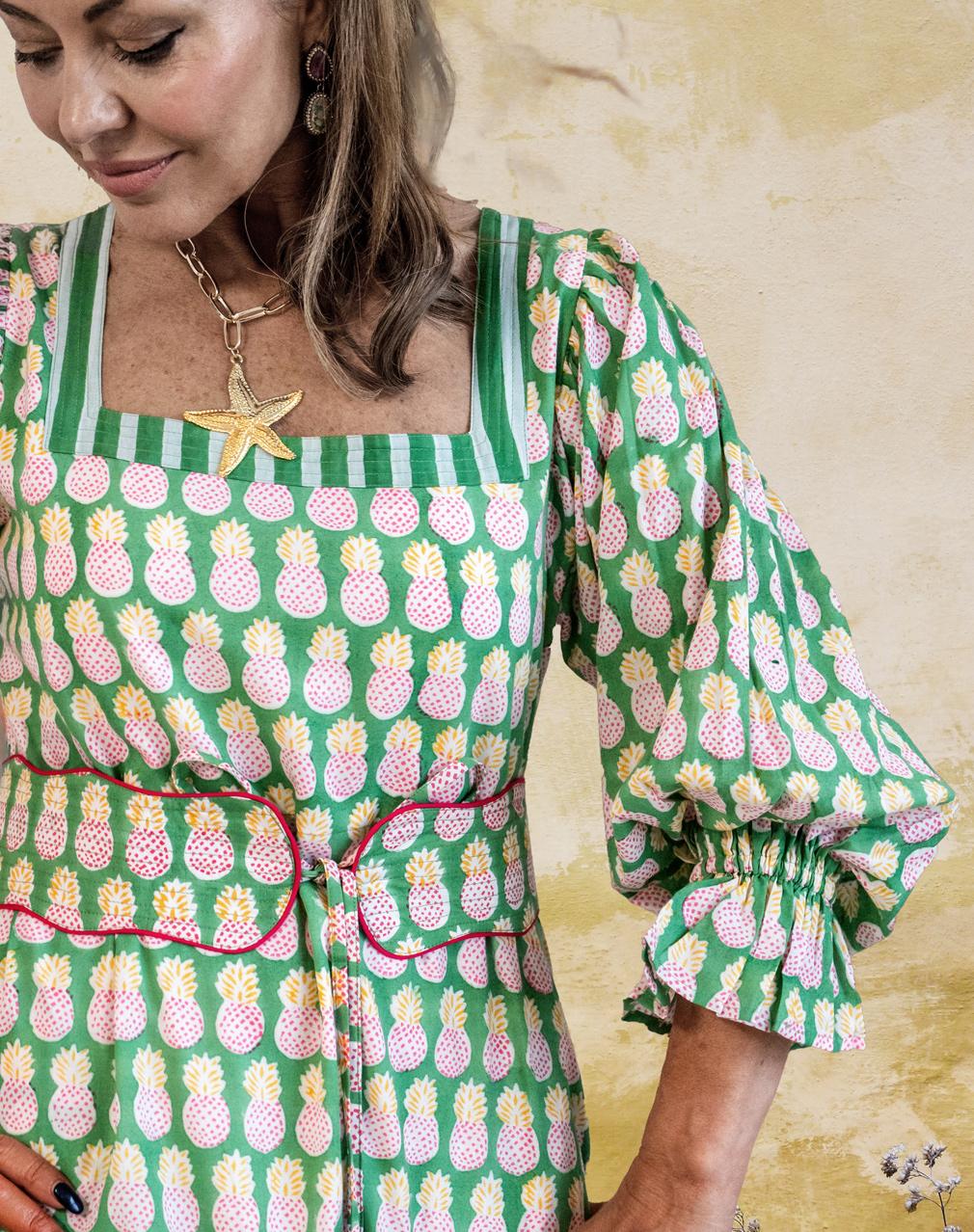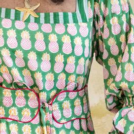 Our ‘Fortune Favours’ beauty boasts hand block printed pineapples.