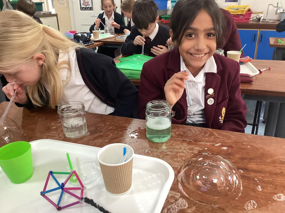 Pupils across the whole school then enjoyed a bubble experience in their science lessons during the week. Bubbles provide the opportunity to study science concepts such as elasticity, surface tension, chemistry, light, and even geometry Pupils engaged in processes such as observations, investigations, challenges and discovery, when blowing and studying bubbles.