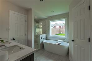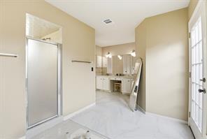 The primary shower is thoughtfully designed with a rain showerhead, handheld spray, and built-in bench for comfort and convenience.
