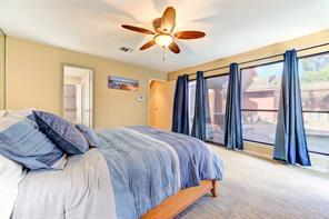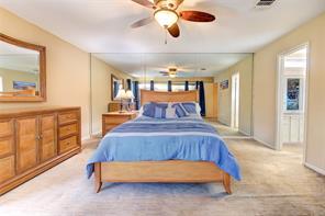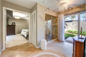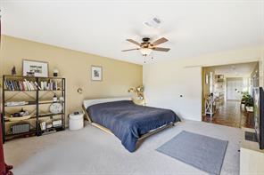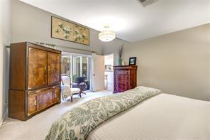 The primary bedroom is spacious and inviting, with sliding doors that lead to the covered patio, providing a seamless connection to the outdoors.