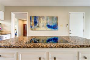 This kitchen view showcases the induction LG cooktop and oven with a custom vent hood and a spacious counter opening, creating an easy flow to the family room for everyday living and entertaining.