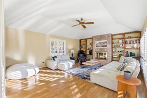 The spacious family room showcases a vaulted ceiling with an exposed wood beam, a bricksurround fireplace, and a built-in wet bar, making it an inviting gathering space.