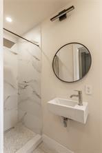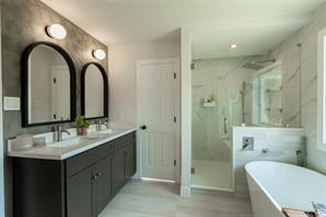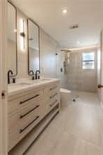 This secondary bath offers dual vanities, a shower, and a Toto Washlet toilet, combining convenience with thoughtful upgrades.