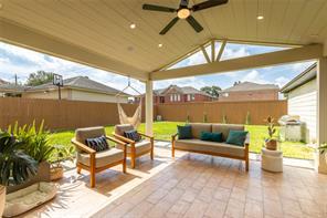 The spacious covered patio overlooks a lush, green backyard, providing a peaceful space for outdoor relaxation and entertaining.