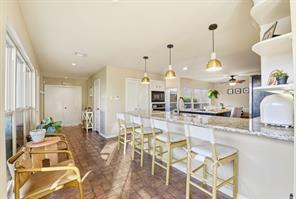 The alternate view of the kitchen features a breakfast bar illuminated by pendant lighting, adding both charm and functionality to the space.