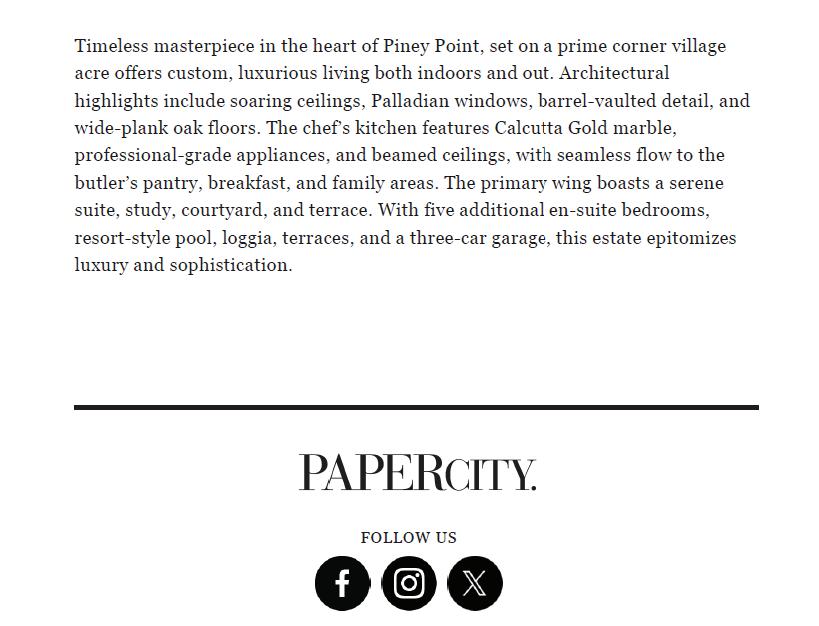 Beautifully blends classic architecture with modern luxury to provide sophisticated entertaining spaces. Highlights include elevator, Segreto Diamond Plaster walls, grand parlor, gourmet kitchen, wine cellar, media room, and lavish primary retreat with dual baths. Pool with cascading waterfall complements the impressive grounds.