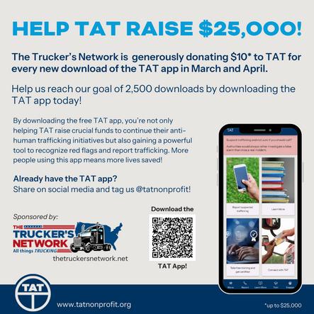 �� Download and share the free TAT app – a powerful tool that helps drivers recognize and report signs of trafficking. It features red flag indicators, training videos, and direct access to the National Human Trafficking Hotline.