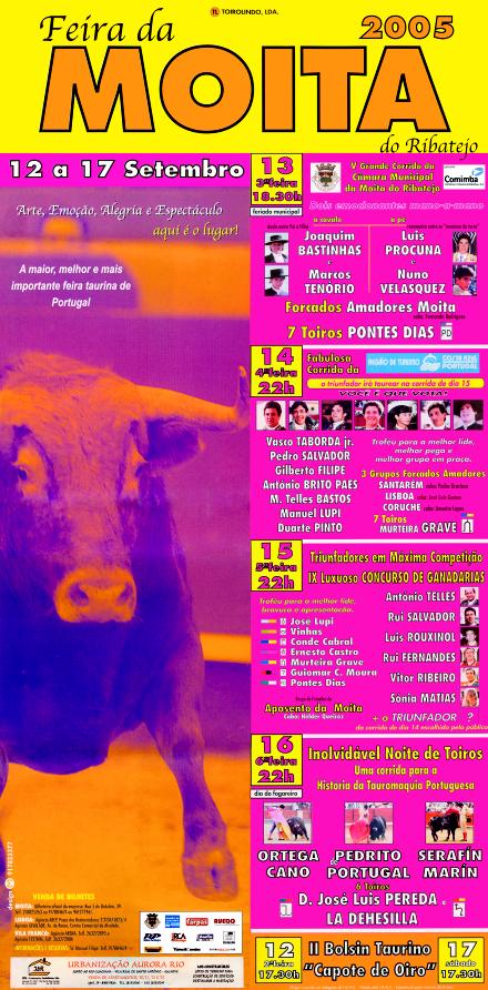 Setembro, este ano com um grandioso carte l, em que pontificam os toureiros moitenses Luís Procuna e Nuno Velasquez, Pedrito de Portugal, Ortega Cano e Serafín Marín, bem como os cavaleiros Joaquim Bastinhas, António Telles, Rui Salvador, Luís Rouxinol e Sónia Matias, entre outros. No decorrer da Feira haverá também as habituais largadas de touros.