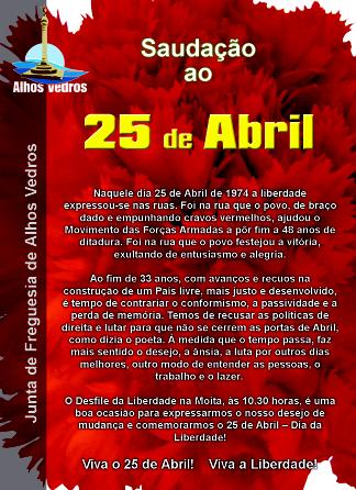 Abril está aí de novo para nos recordar que trinta e três anos antes rasgara os horizontes nebulosos e acalentara as esperanças de um Povo sacrificado. São trinta e três anos de país novo! Contudo as injustiças crescem a cada ano neste século XXI. Recuos sociais vão fazendo caminho. Progresso lento face aos parceiros europeus. Está pois difícil de compreender que as vítimas principais não entendam este jogo do gato e do rato, esta moral do cinto apertado.