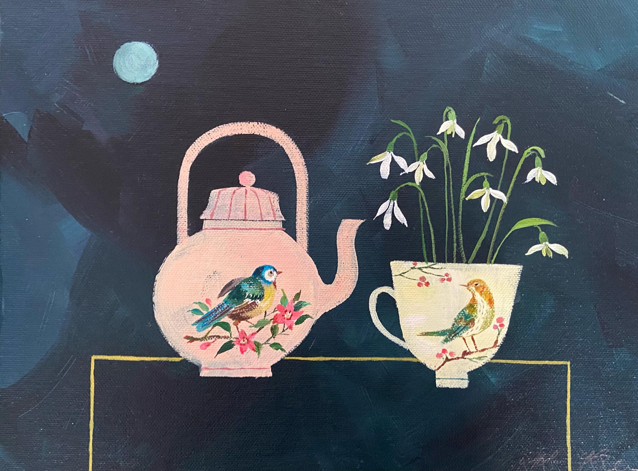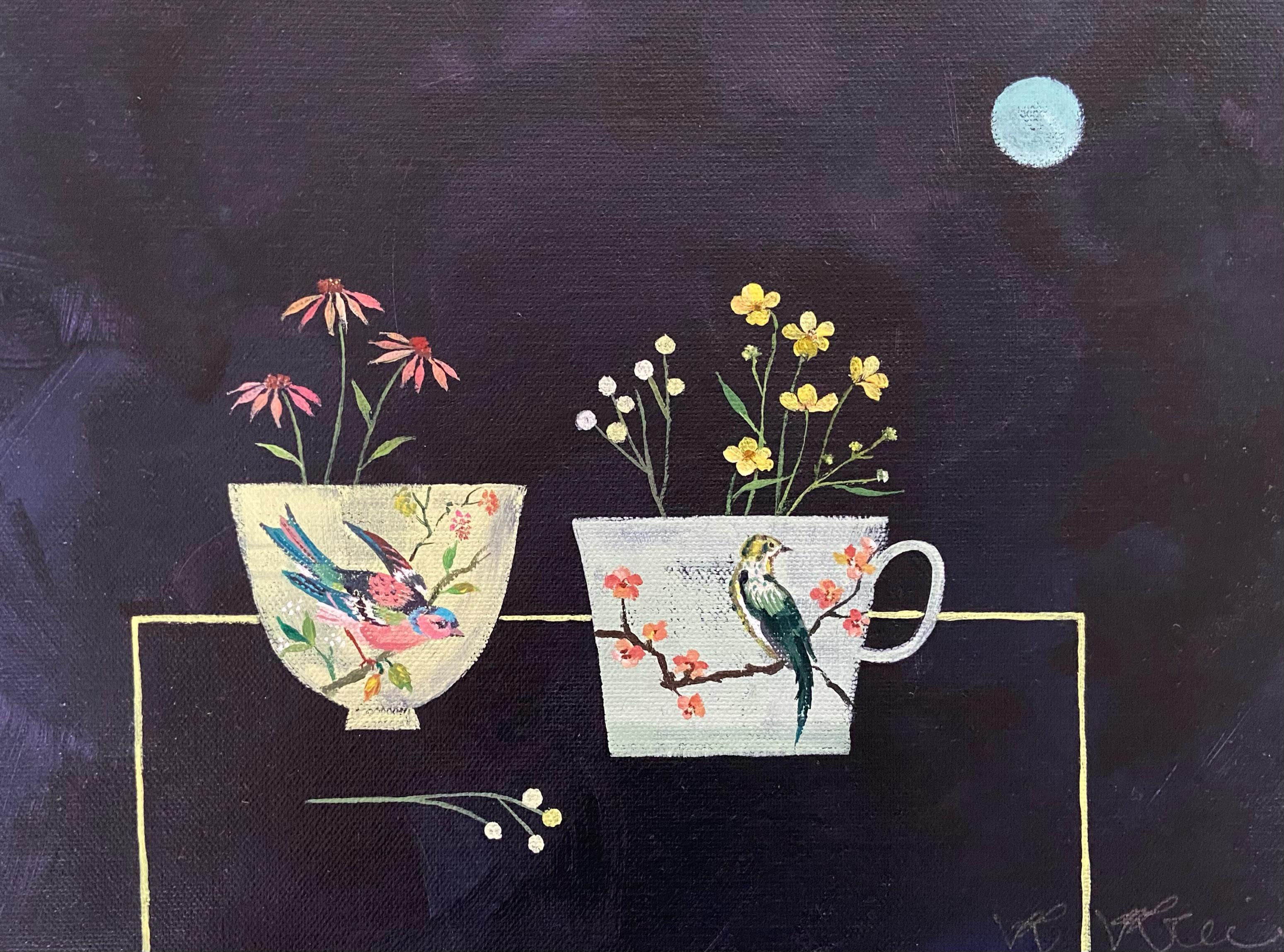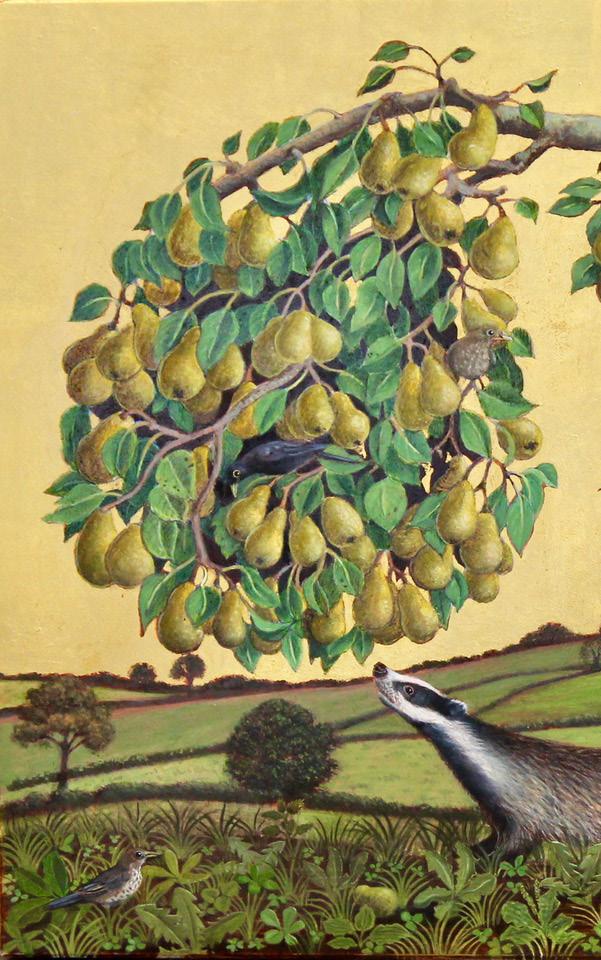 “My work is inspired by the Gothic paintings of Europe and their joyful celebration of an elevated reality. I aspire to their luminous palettes enhanced with the elegance of gold and copper leaf. My imagery is a celebration of the timeless joys of gardens, meadows, birdsong and afternoon tea. These paintings are all on carefully prepared gesso panels, painted in egg tempera; and over painted in oils”.