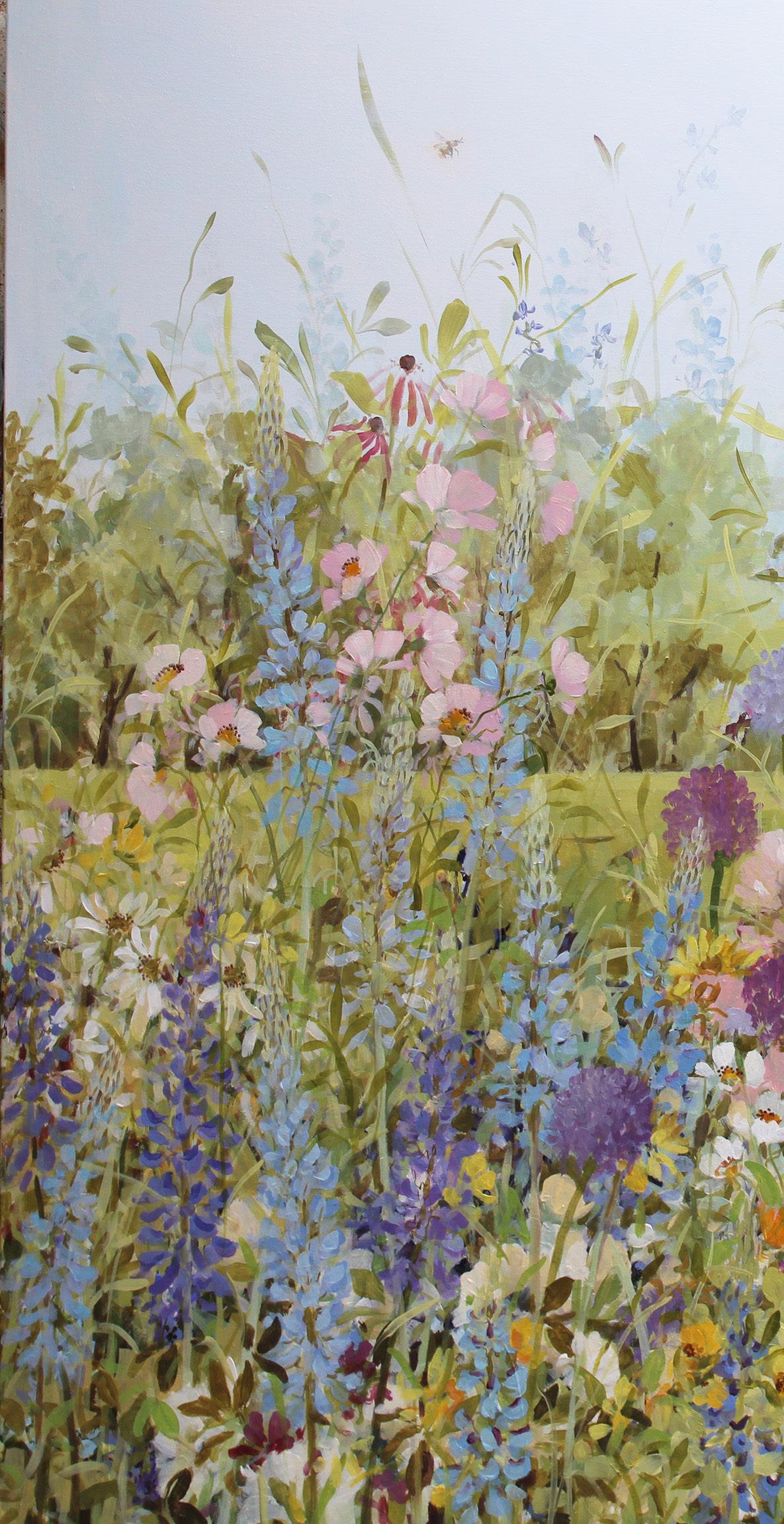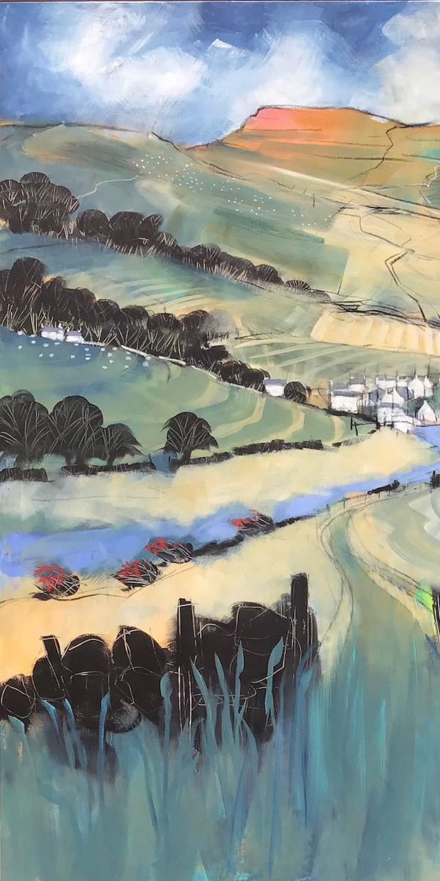 In Katarzyna’s own words: “I paint distant views of a landscape peppered with buildings. Water or valleys may divide the dwellings yet they are all connected by the echoing shapes and restful hues of my palette. A foreground detailed with wild flowers accentuates the perspective planes and graphic lines suggest paths and boundaries.”