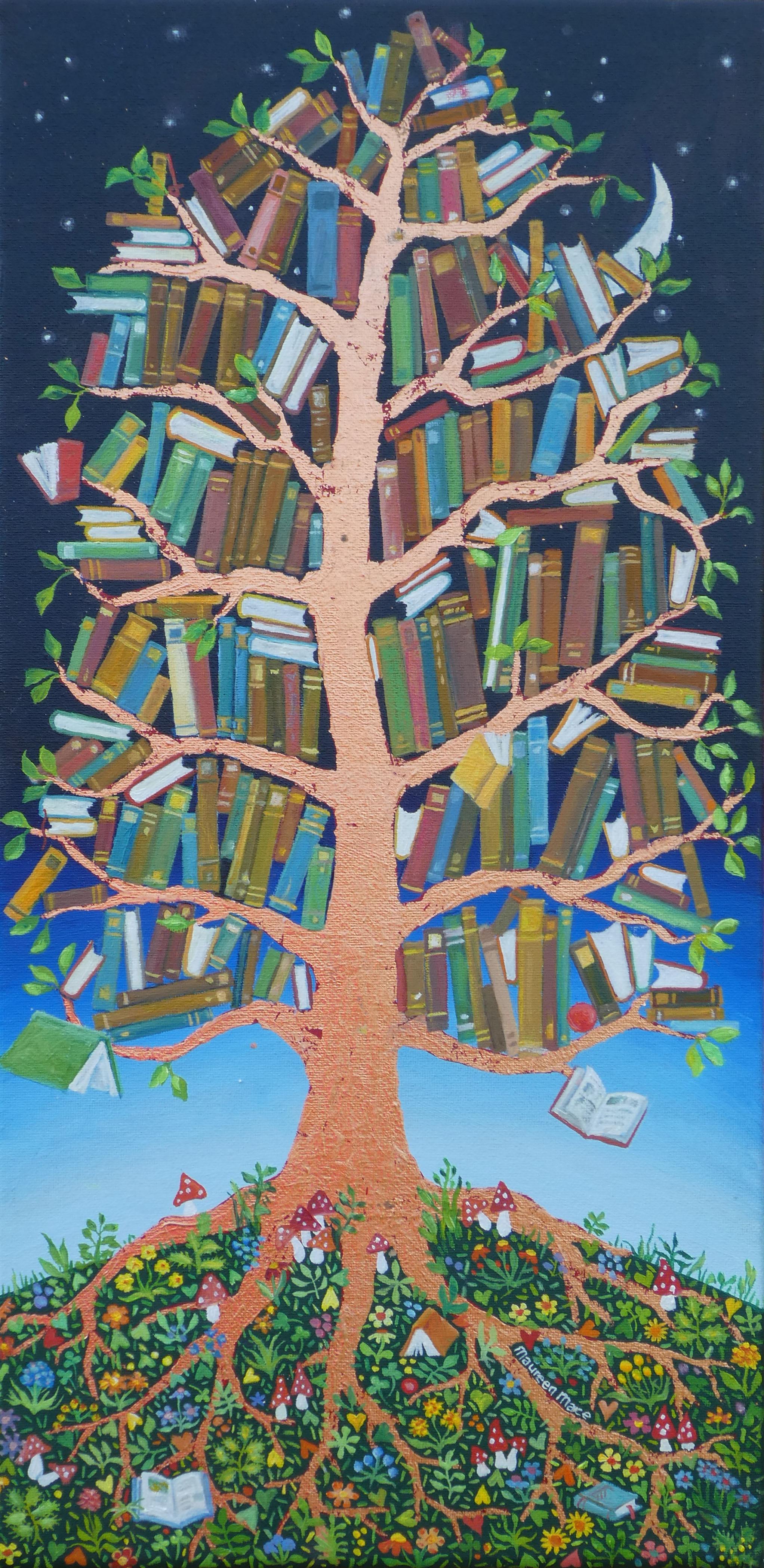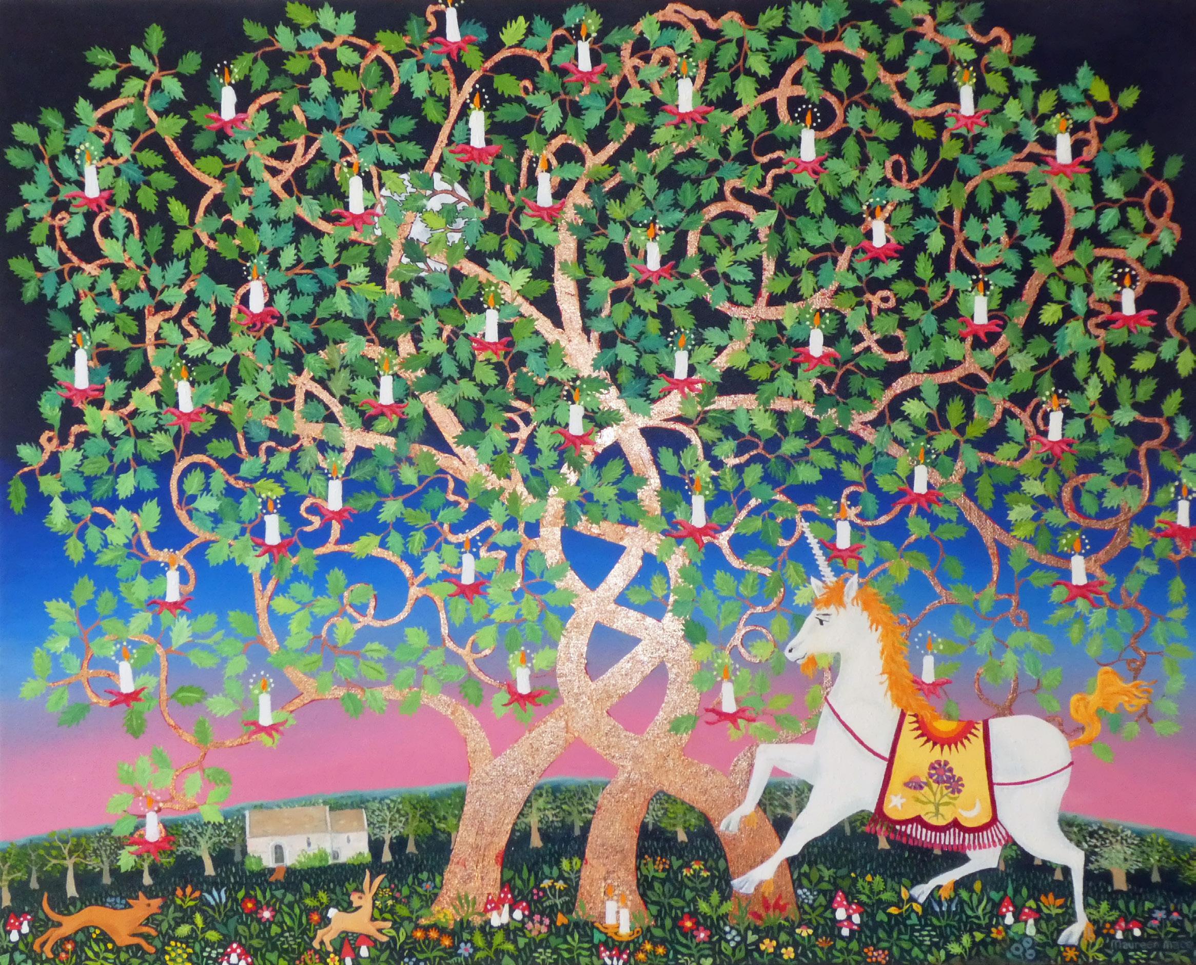 Maureen Mace lives in Cambridge where she spends her time painting and teaching art. Cambridge is a huge influence in her work. She loves the beautiful, historic city with its wide, open spaces, great architectural buildings, old university traditions and, of course, its cows. Maureen adds into her works the rich night skies, shining moons, and her taste for Medieval Art to form the basis for these intricate, dream-like paintings.