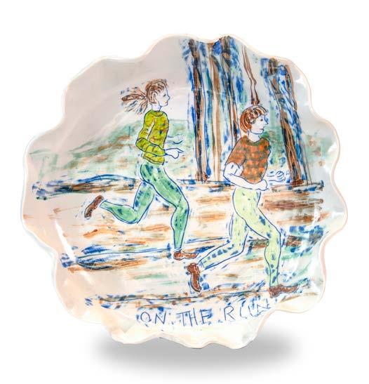 The idiosyncratic scalloped or ornamental edges on the handmade plates and accentuated feet and necks of the vessels, are weighed with the attention Gail gives to their surfaces. Sharp and blurry lines, Mishima inlay, etching techniques combined with graffito and underglaze washes. They have a transparent glaze layer to highlight the etched, drawn and observed stories that Gail shares with her audience.