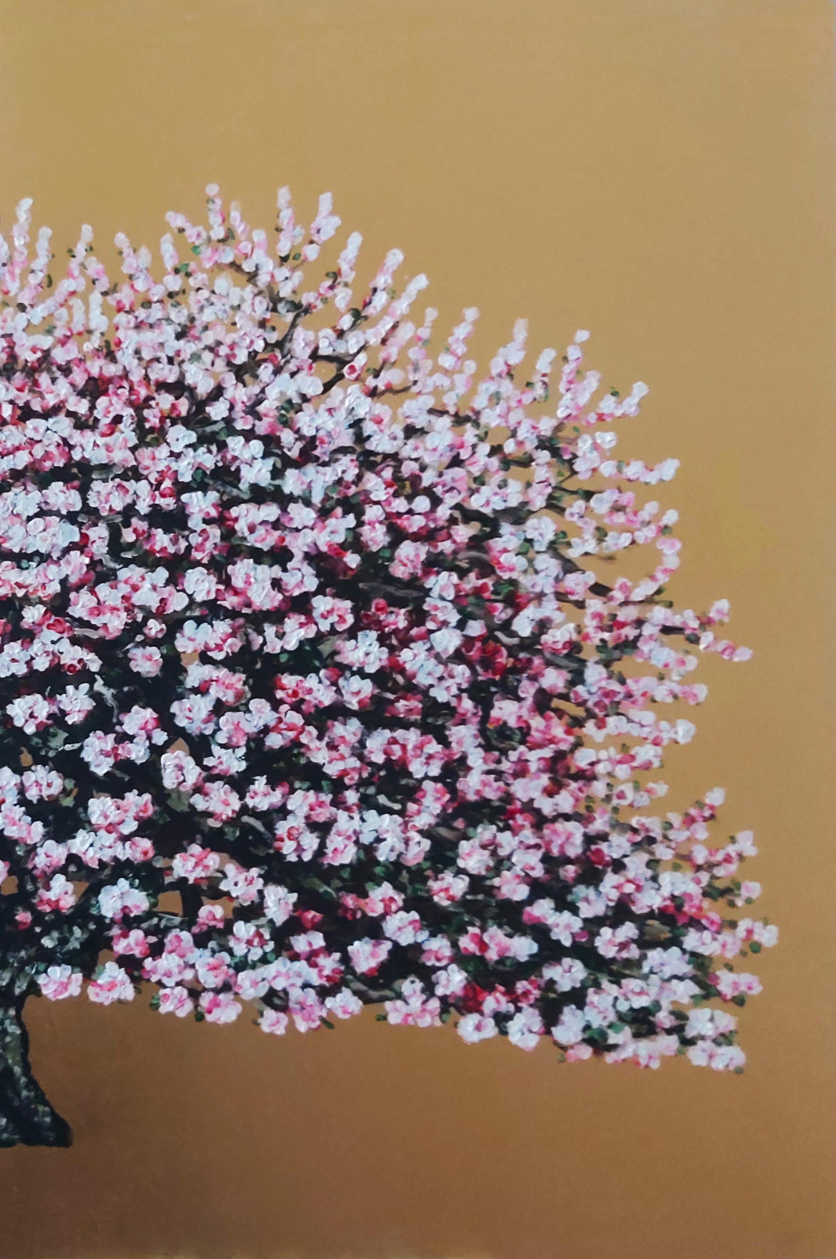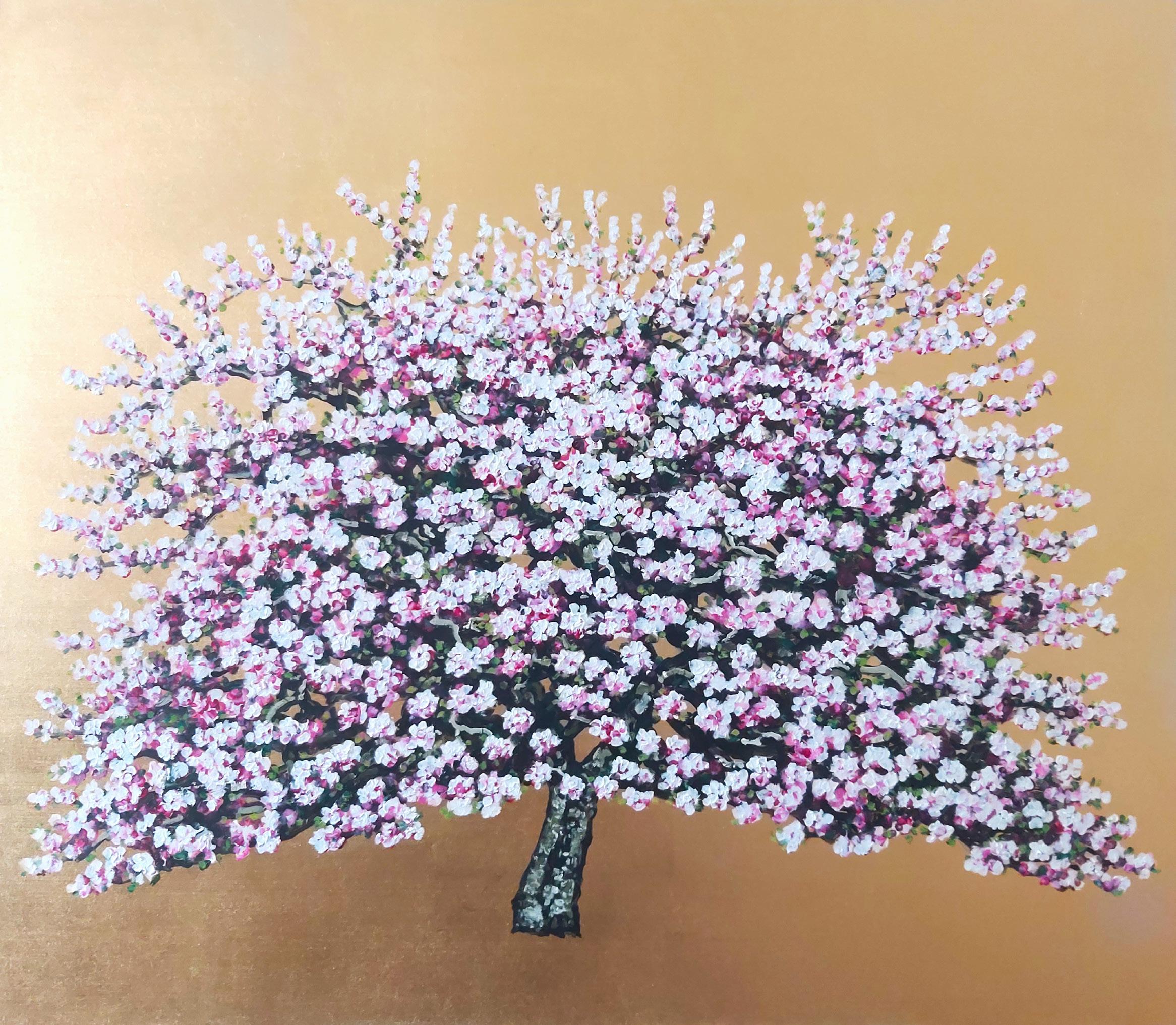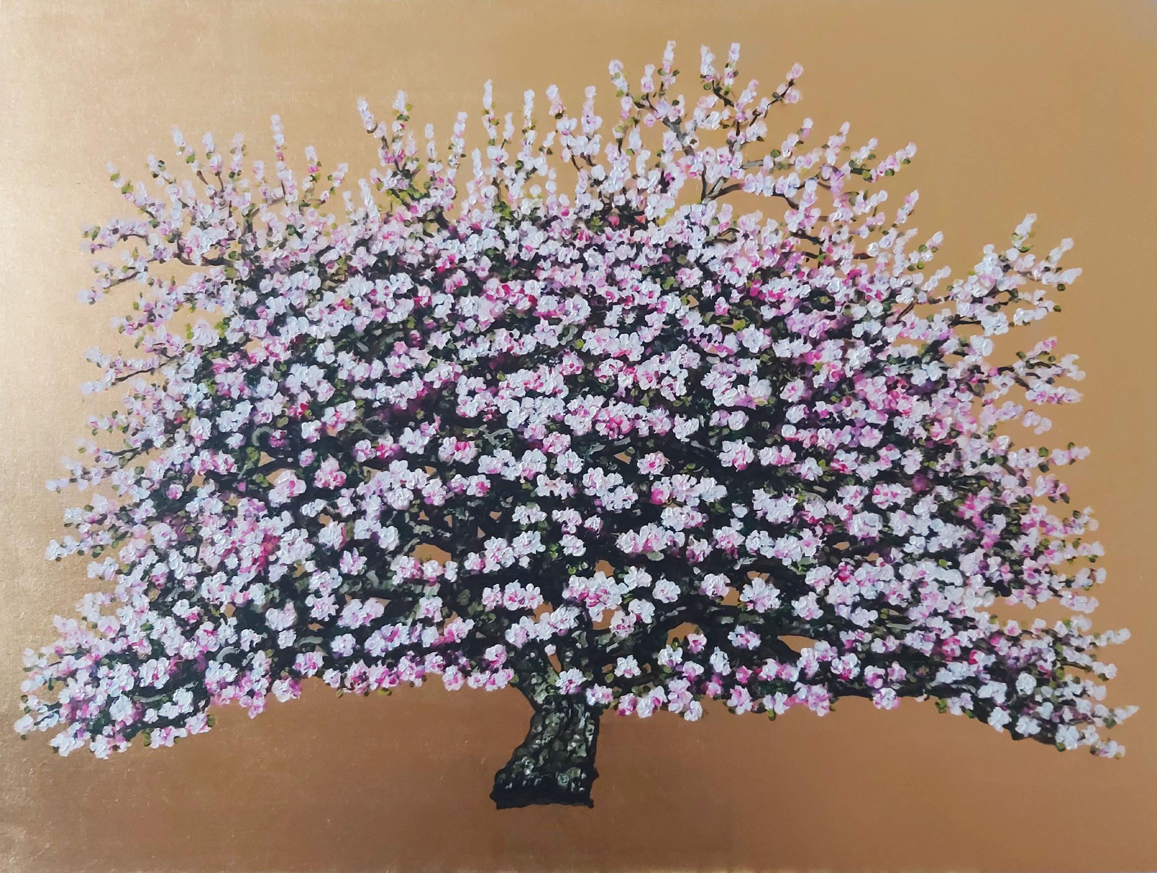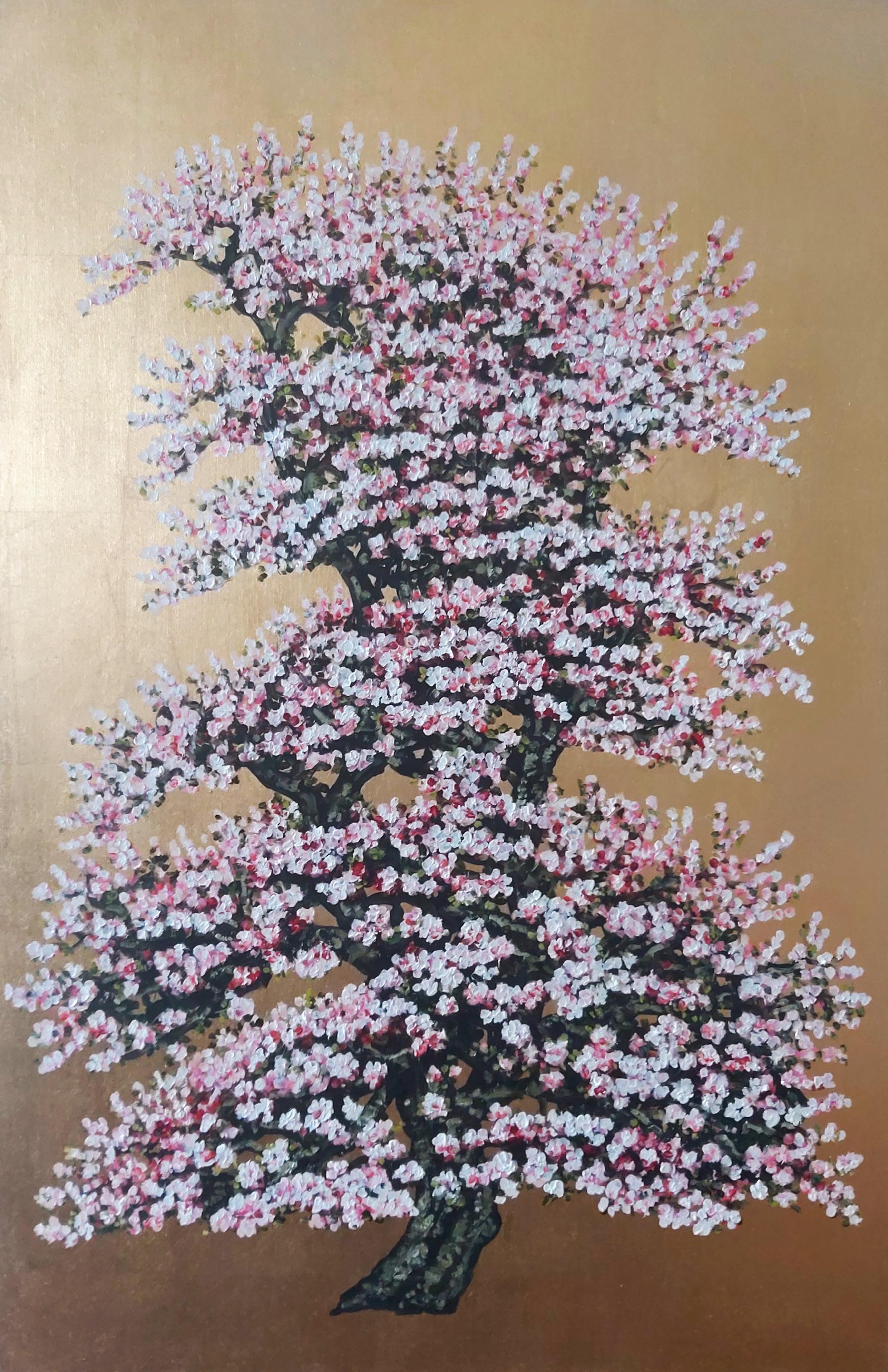 Queenie, Flowering Garden Cherry Blossom Oil and Gold Leaf on Canvas