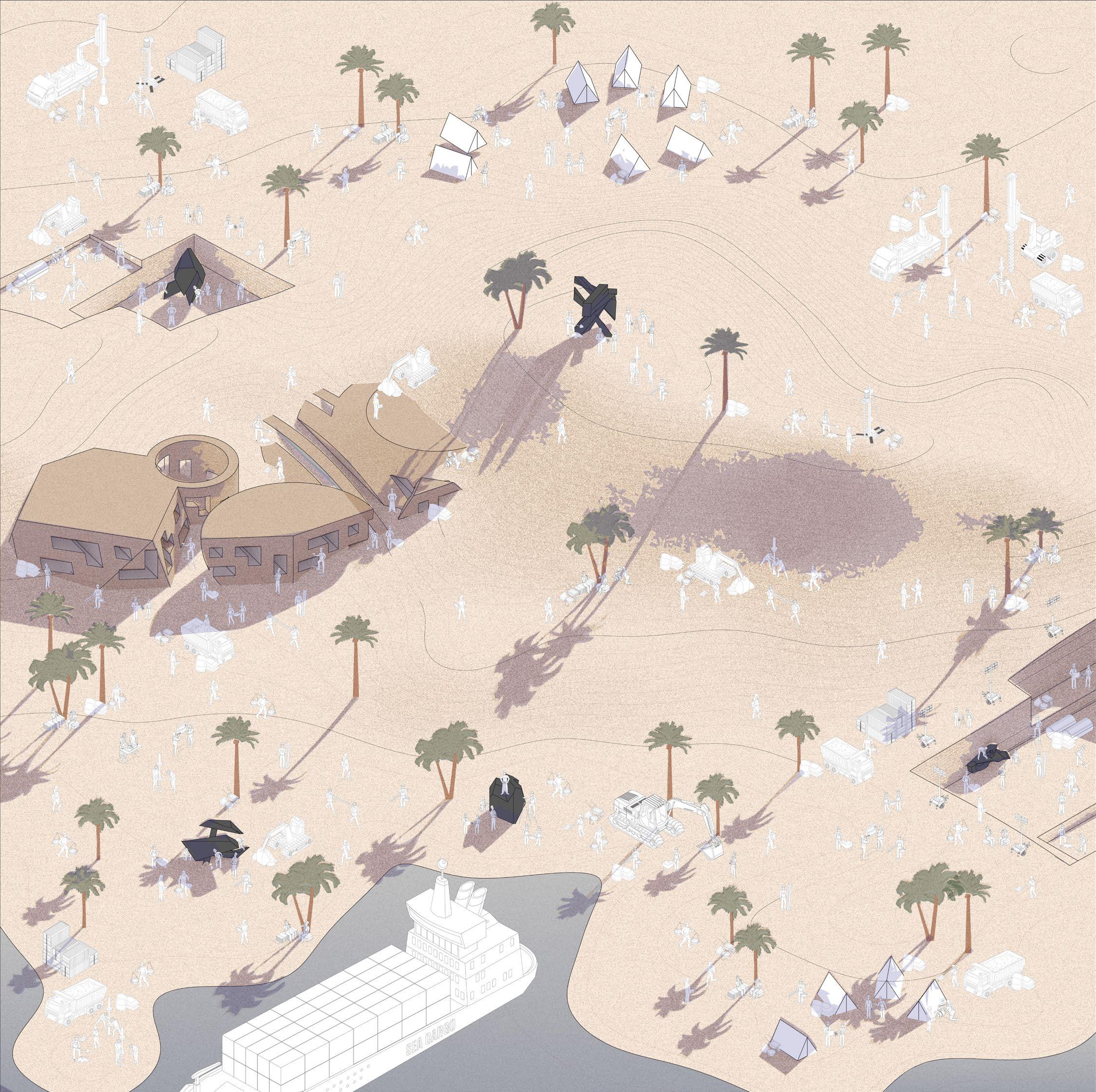 The landscape on the right uses past exercises from my representation course to create a “dig-site” filled with various inhabitants. I used key landmarks to cluster figures to create smaller storylines within the broader narrative.