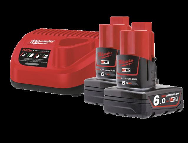M12 NRG-602. M12 6,0 Ah REDLITHIUMION batterisett 2 x M12 6,0 Ah REDLITHIUMION batterier og en C12C lader (120 min.). # 51291312
