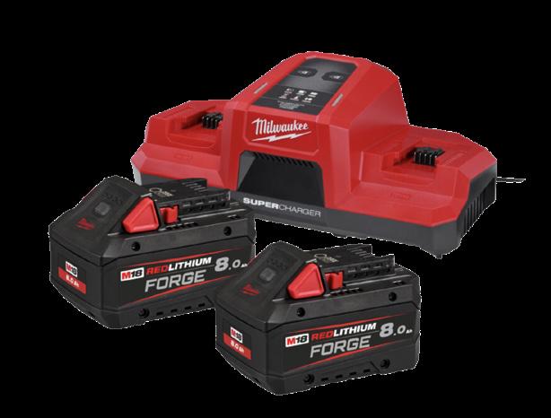 M18 FORGENRG-802DBSC. M18 8,0Ah FORGE batterisett inneholder 2 x M18 FB8 FORGE batterier og én M18 DBSC superhurtig lader med dobbelport. # 60667219
