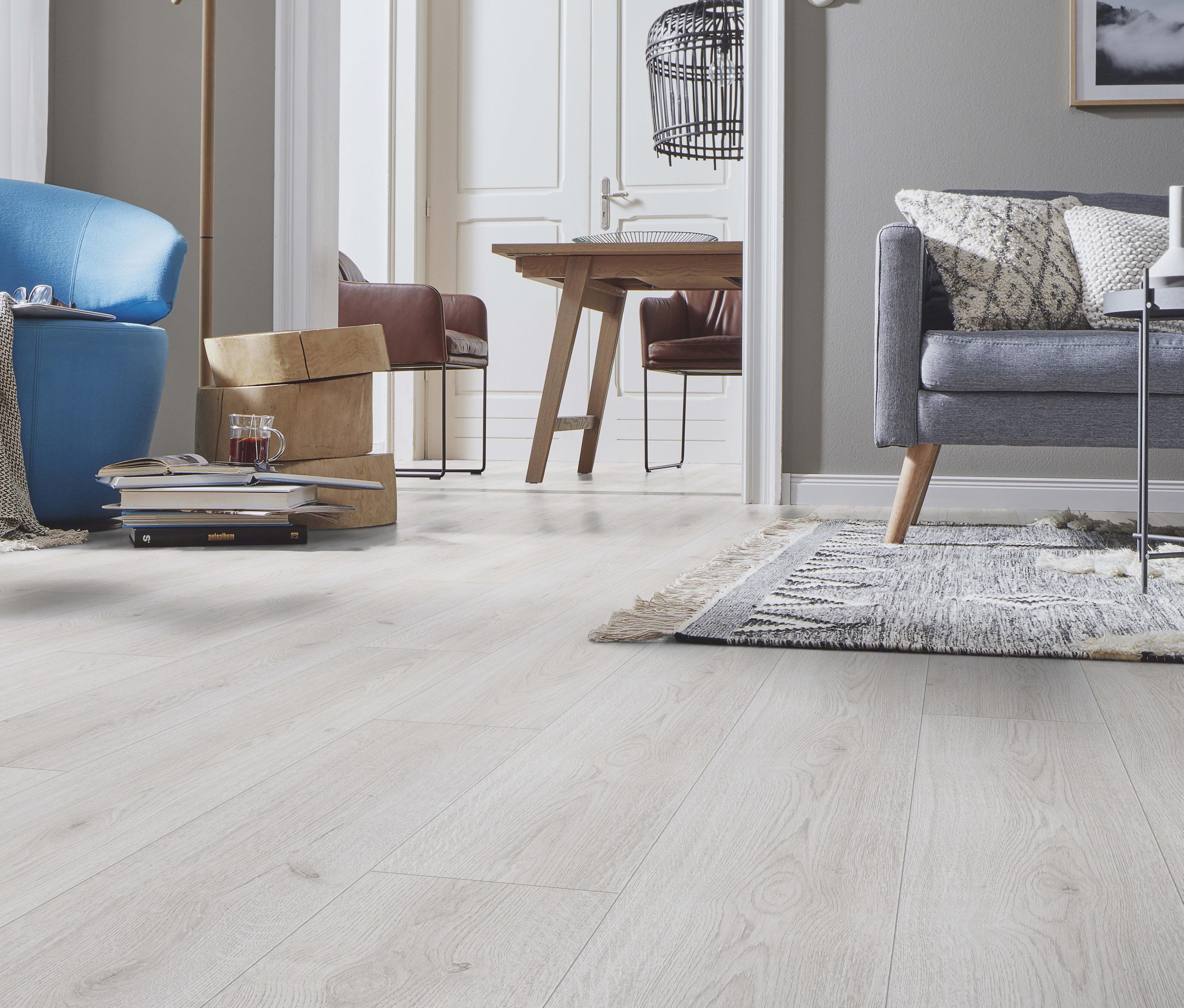 Superior Advanced Trend Oak White. Den matte overflaten og 4 siders V-fas gir gulvet et autentisk utseende. Str. 8 x 193 x 1380 mm. Pris pr. m2 # 56631426