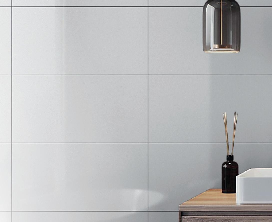 Classic White High Gloss med flisemønster 60x30cm. Grå fuge. Størrelse 11x620x2390mm.