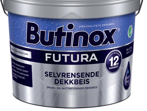Butinox Futura Selvrensende Dekkbeis er en høyteknologisk dekkbeis med selvrensende egenskaper som gir et varig nymalt og rent utseende, samt effektiv beskyttelse mot sopp og algeangrep. # 55970074