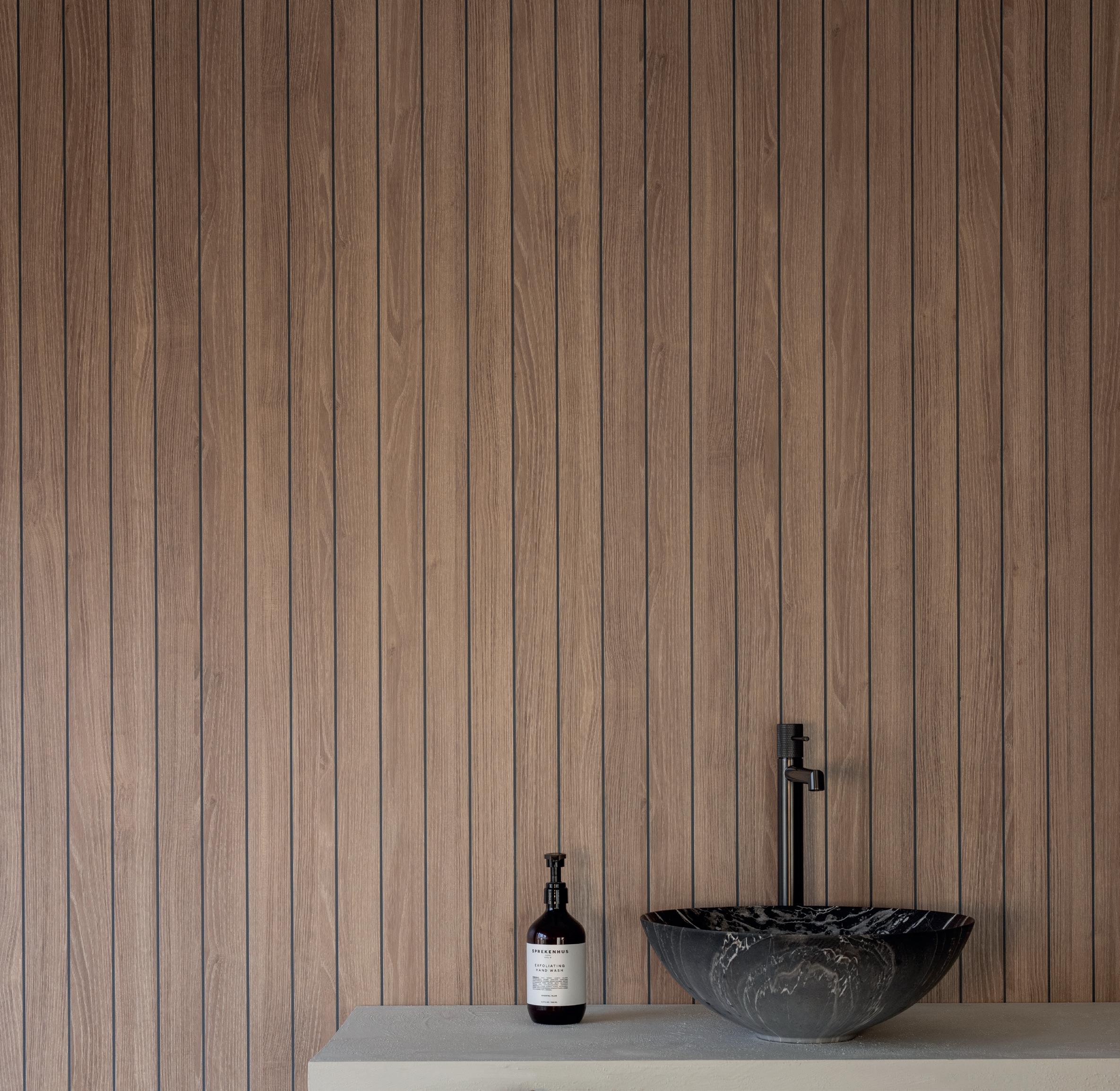 Refresh Oak med spilemønster 6x240cm. Sort fuge. 100 % vanntette baderomspaneler. Godkjent i henhold til SINTEF og Våtromsnormen.