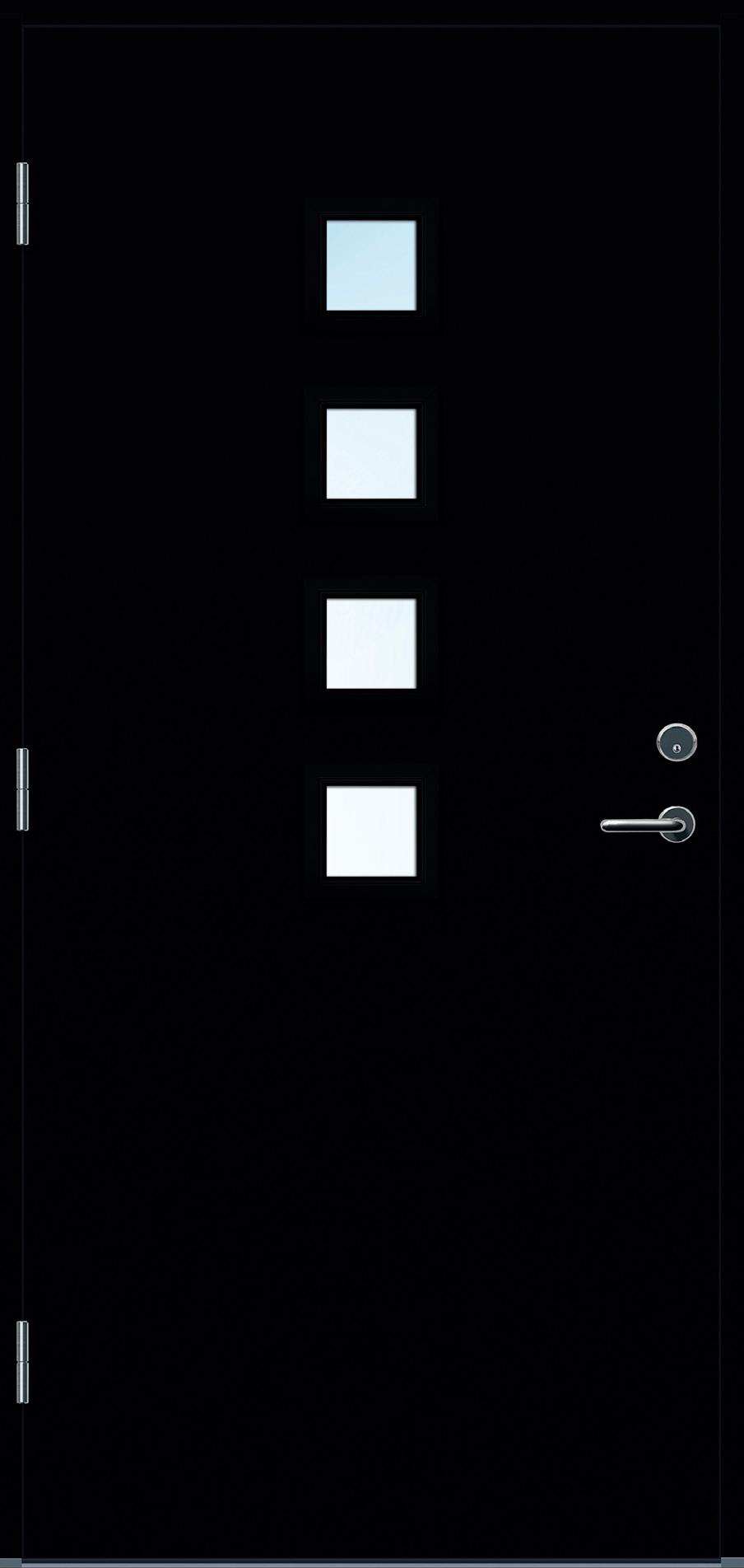 Ytterdør i moderne design med god isolasjonsevne og høy kvalitet. Ramtre av fingerskjøtt furu og laminert finer, overflate av HDF. Pris eks. vrider.