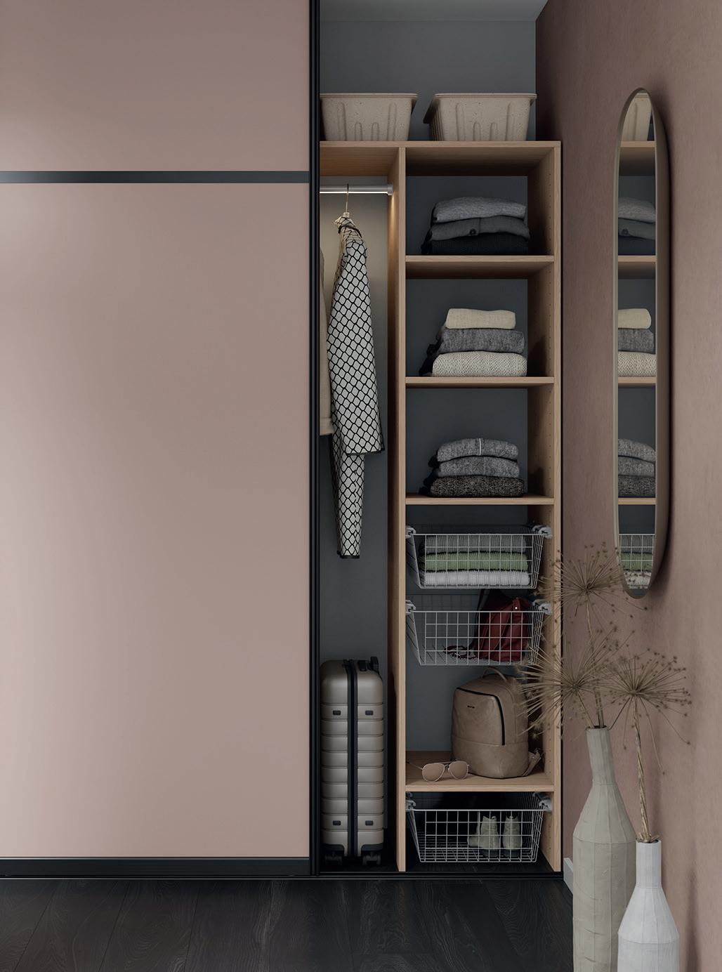 soverommet til klesoppbevaring. Heldigvis er det mange muligheter! Det optimale for et avslappende rom er at man har mulighet en til å skjule alt som ikke har med søvn og hvile å gjøre. Helst bør garderoben opplev es så skreddersydd for rommet som mulig, og kunne lukkes igjen. Har du en hel vegg til rådighet, vil en integrert garderobevegg være et godt valg. Garderobeskap kan også med hell benyttes som romdeler i et større soverom, og separere sovesonen fra garde robedelen.