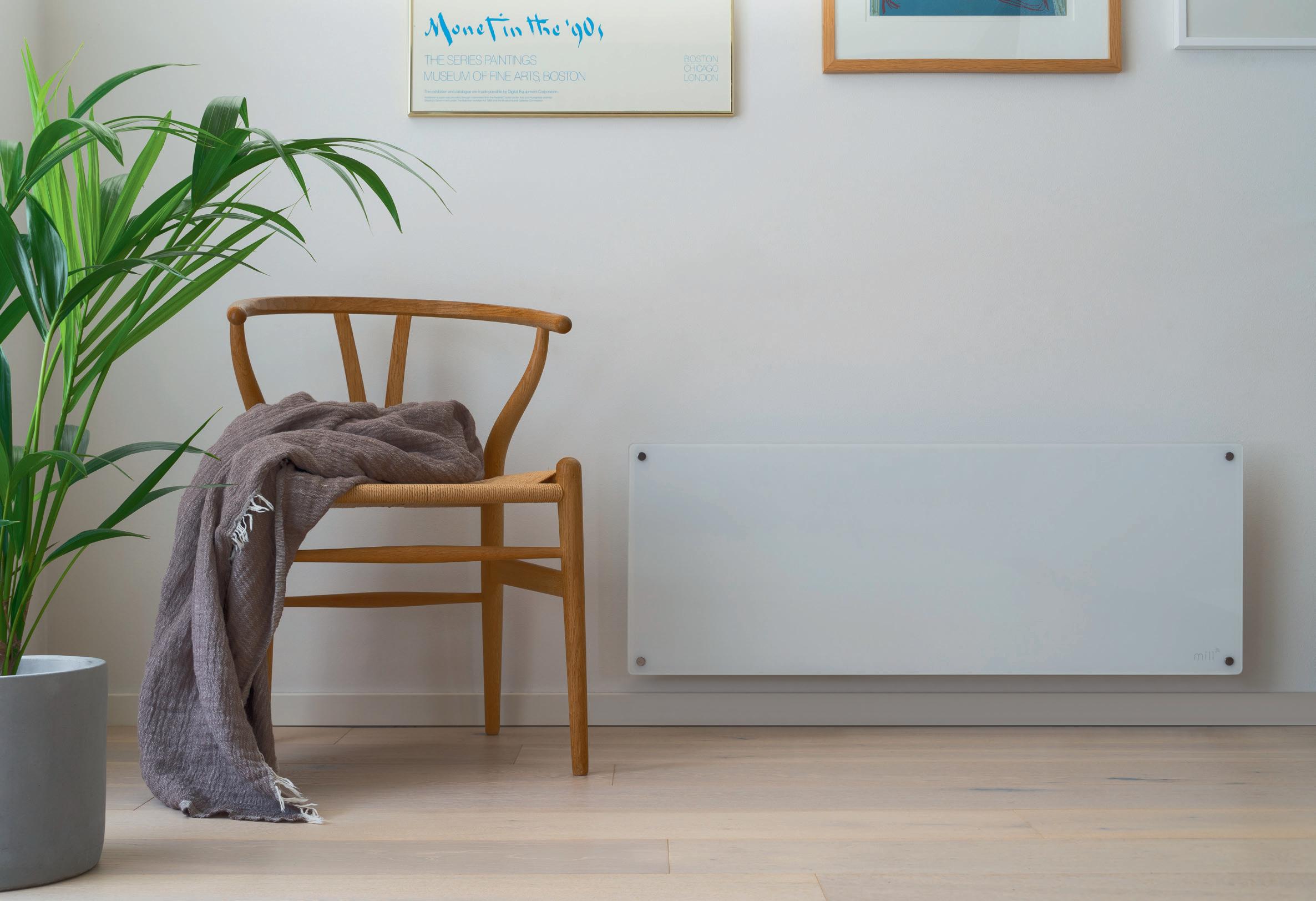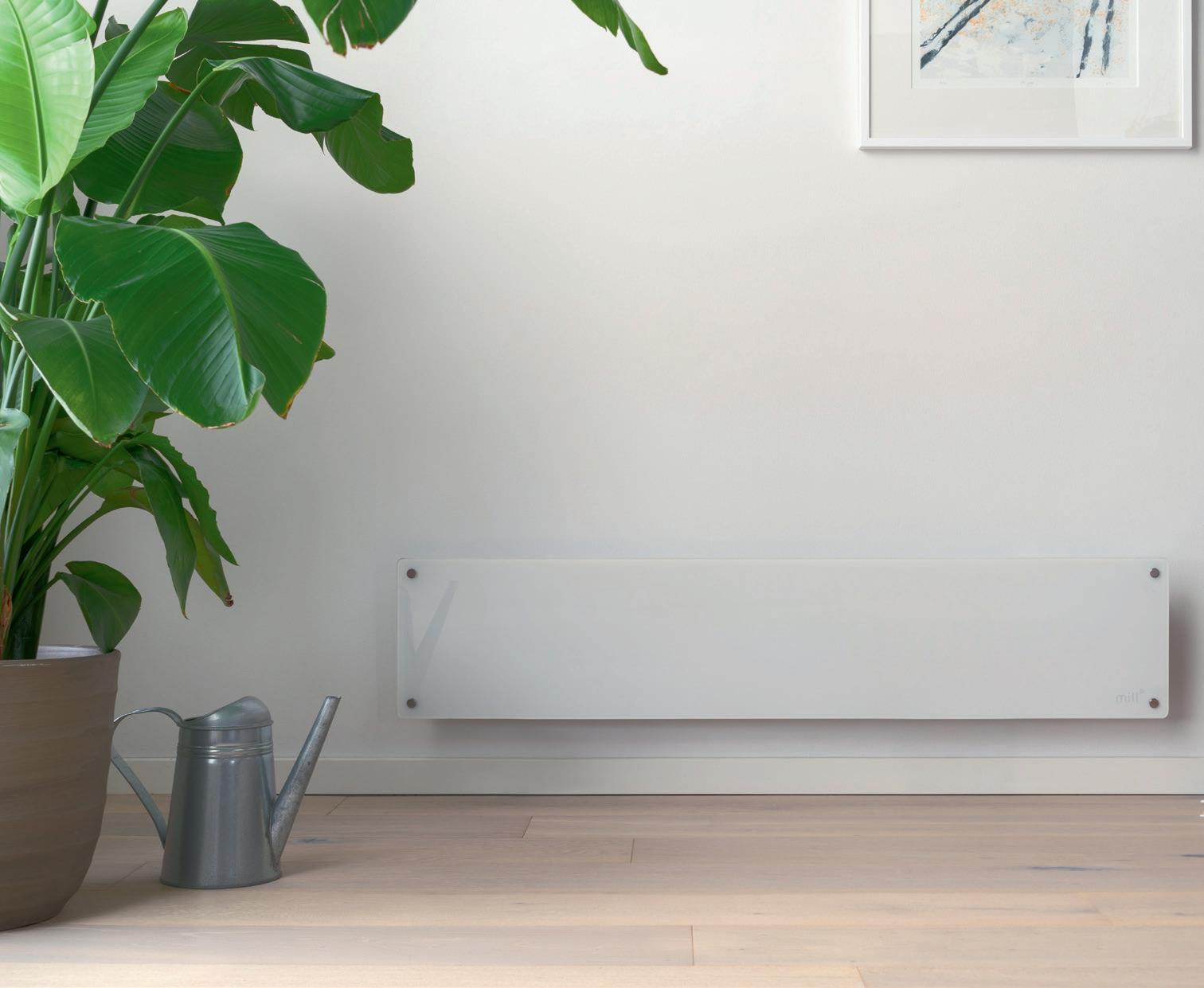 Mill Glass WiFi panellist Generasjon 3 1050W. Mill panellist med en elegant hvit glassfront og appstyring (Gen 3 WiFi). Den lave høyden på ovnen gjør at den passer utmerket under vinduer. #