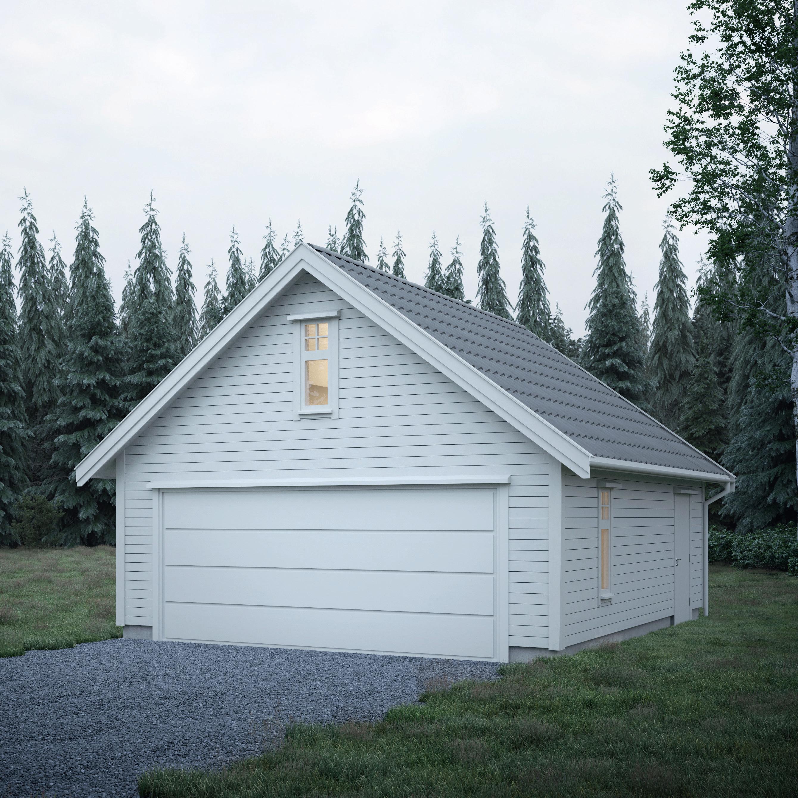 Denne garasjen har et tradisjonelt saltak med ark. Garasjen har stor dobbel port og god plass til oppbevaring både på grunnplan og hems.