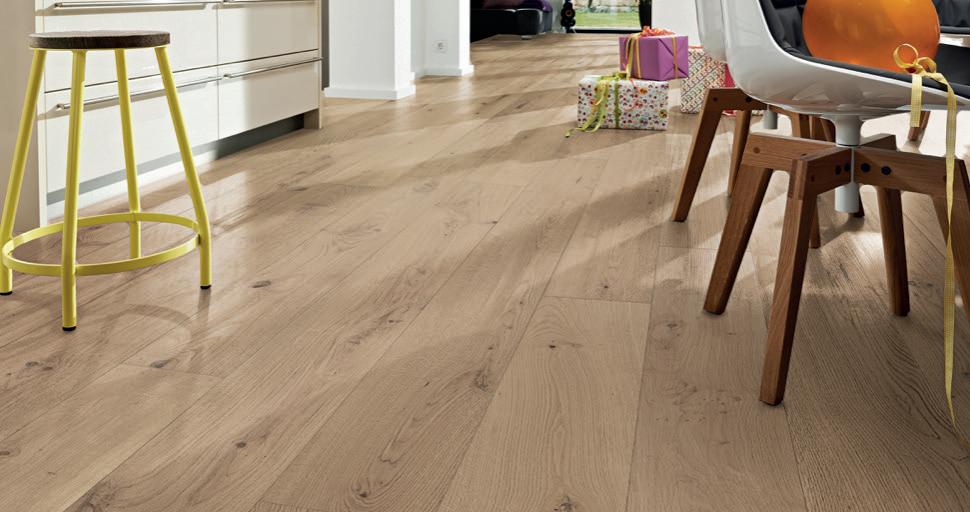 Saga Premium Pearl Oak. Tidsriktige innfarginger og lun mattlakk som forsterker gulvets naturlige uttrykk og følelse. Str. 14 x 180 x 1800 mm. Pris pr. m2 # 52984820