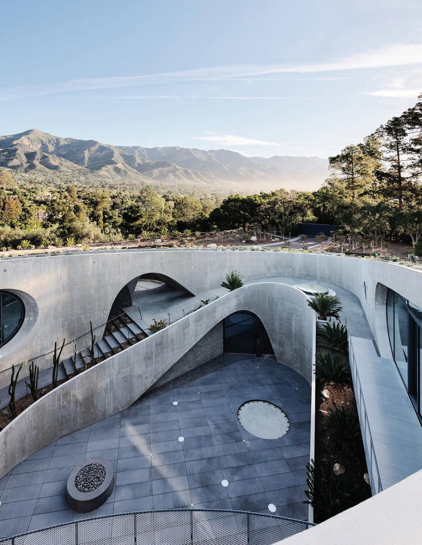 Designed by Robin Donaldson of Donaldson + Partners, this “house for the twenty-first century” was created for two artists to blend architecture, landscape, and art. The circular concrete and glass structure, topped with solar panels and a landscaped rock garden, is accessed via a suspended walkway and a semi-circular “wormhole” entry. Inside, a great room is bathed in natural light from concave glazing and opens to two courtyards: an avocado-shaped seating