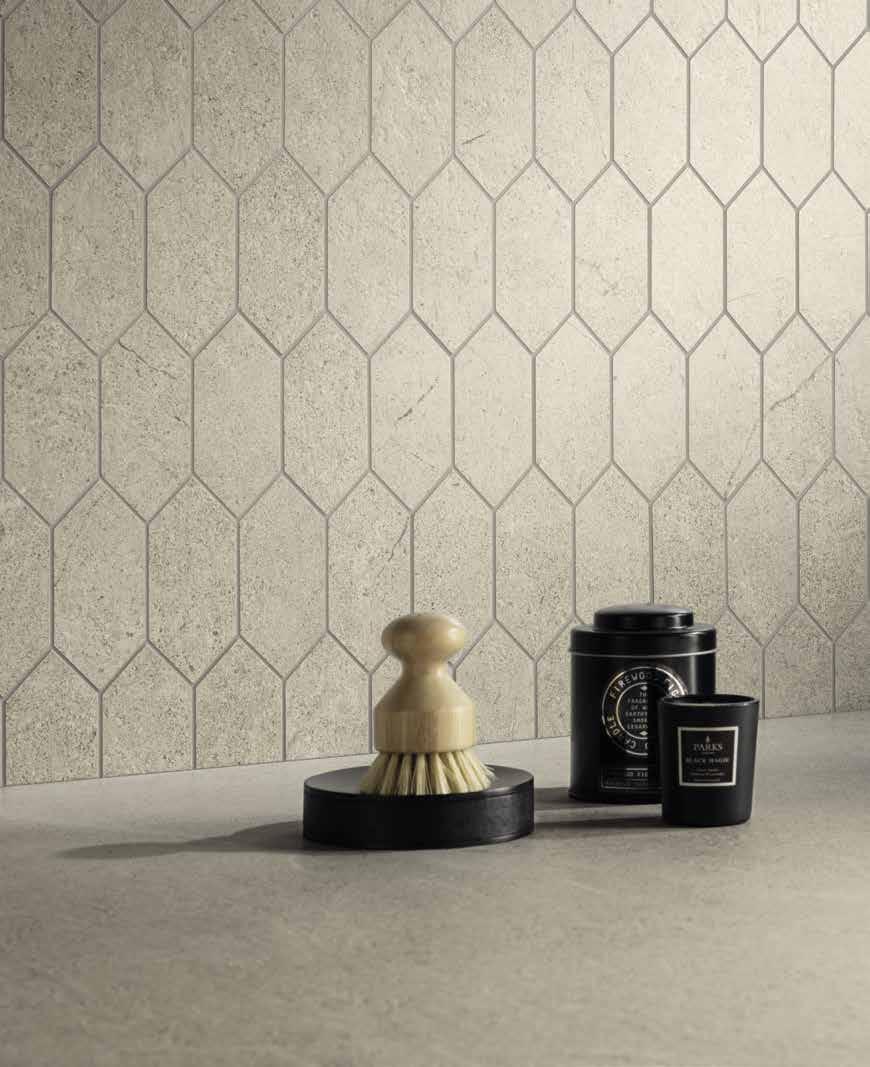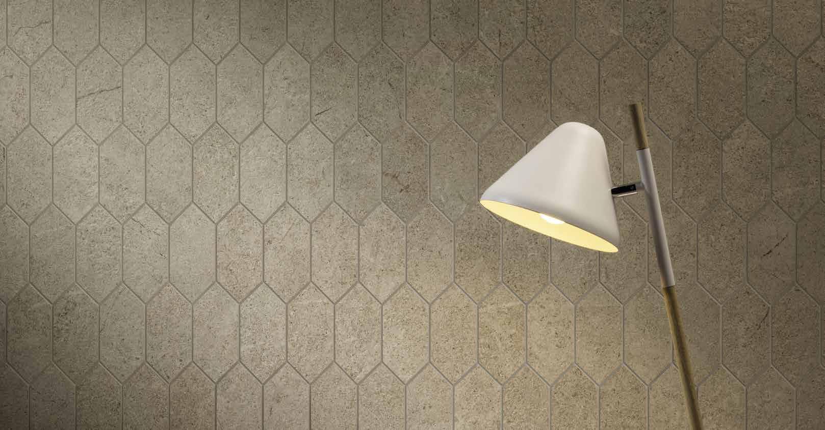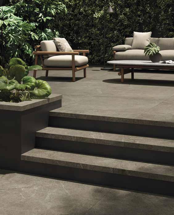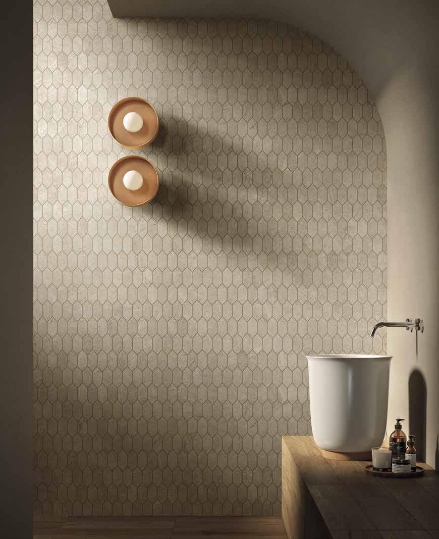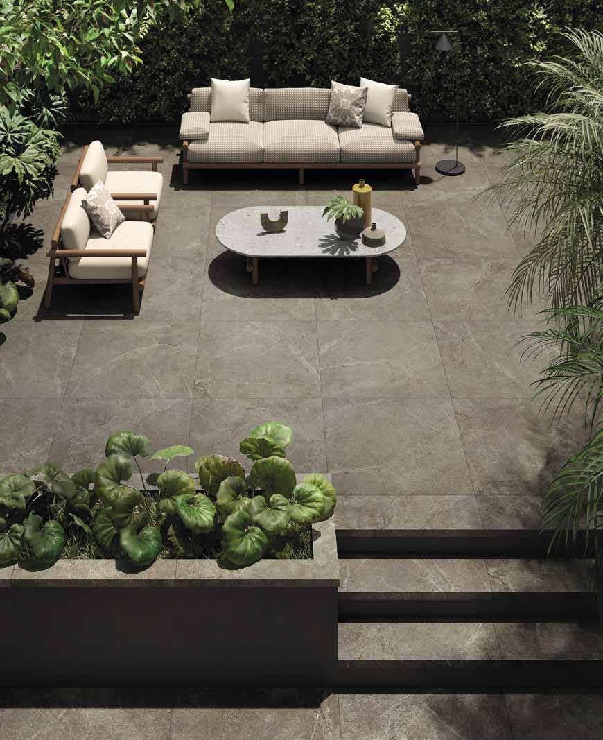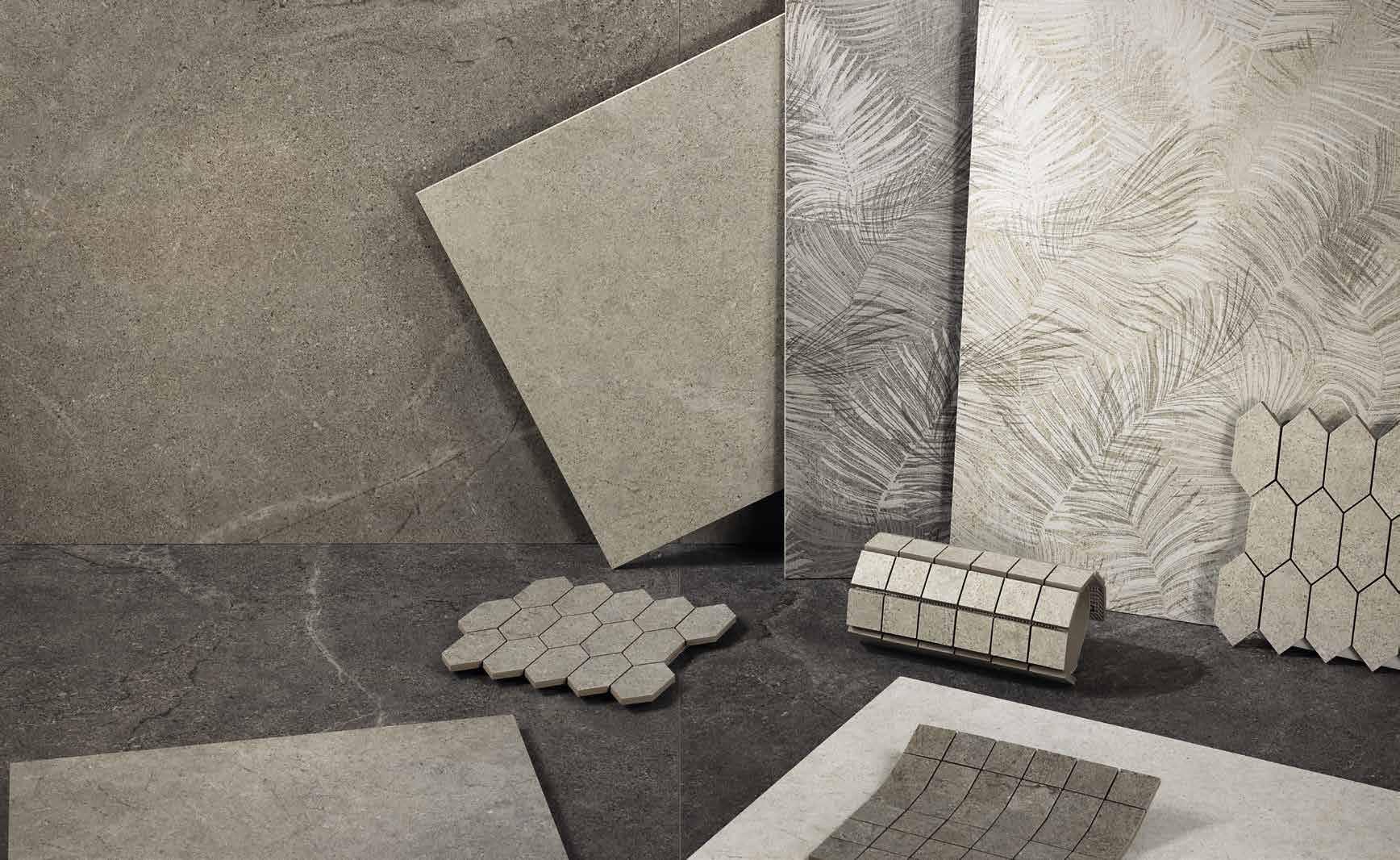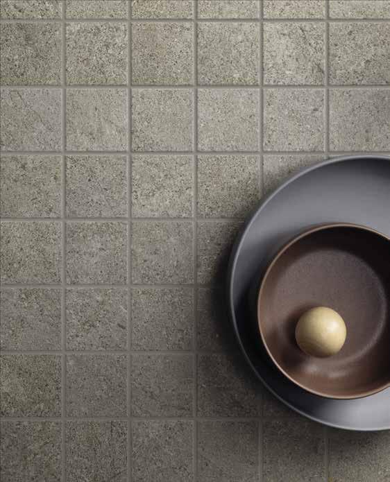 An elegant stone effect surface that owes its charm to an infinity of small graphic details // Harmonic, chromatically compact textures, available in five natural, highly versatile shades // Four formats, one indoors and one outdoors version, two mosaics and two decorative pieces round out this collection, conceived to satisfy the most demanding designer //