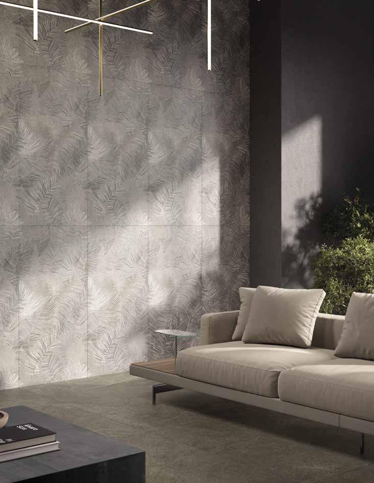 Un elegante effetto pietra che deve il suo fascino a un’infinità di piccoli dettagli grafici // Una texture armonica e cromaticamente compatta, declinata in cinque nuance naturali e versatili // Quattro formati, una superficie da interno e una da esterno, due mosaici e due decori completano una collezione con una spiccata vocazione alla progettualità //