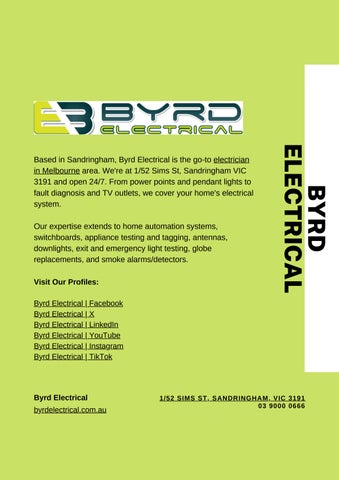 Based in Sandringham, Byrd Electrical is the go-to electrician in Melbourne area. We're at 1/52 Sims St, Sandringham VIC 3191 and open 24/7. From power points and pendant lights to fault diagnosis and TV outlets, we cover your home's electrical system.