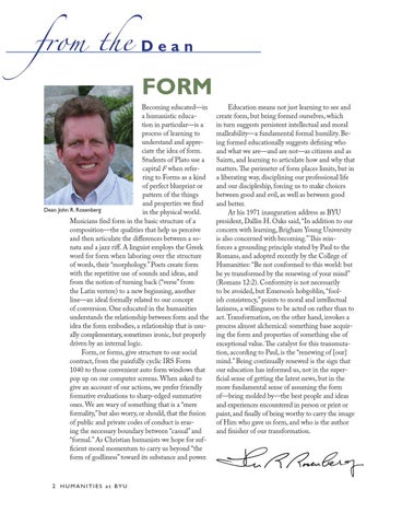 FORM Becoming educated—in a humanistic education in particular—is a process of learning to understand and appreciate the idea of form. Students of Plato use a capital F when referring to Forms as a kind of perfect blueprint or pattern of the things and properties we find Dean John R. Rosenberg in the physical world. Musicians find form in the basic structure of a composition—the qualities that help us perceive and then articulate the differences between a sonata and a jazz riff. A linguist employs the Greek word for form when laboring over the structure of words, their “morphology.” Poets create form with the repetitive use of sounds and ideas, and from the notion of turning back (“verse” from the Latin vertere) to a new beginning, another line—an ideal formally related to our concept of conversion. One educated in the humanities understands the relationship between form and the idea the form embodies, a relationship that is usually complementary, sometimes ironic, but properly driven by an internal logic. Form, or forms, give structure to our social contract, from the painfully cyclic IRS Form 1040 to those convenient auto form windows that pop up on our computer screens. When asked to give an account of our actions, we prefer friendly formative evaluations to sharp-edged summative ones. We are wary of something that is a “mere formality,” but also worry, or should, that the fusion of public and private codes of conduct is erasing the necessary boundary between “casual” and “formal.” As Christian humanists we hope for sufficient moral momentum to carry us beyond “the form of godliness” toward its substance and power.