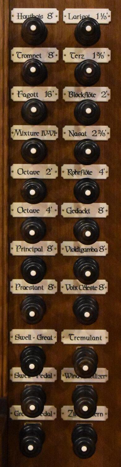 Turn on the “light switch” to the right underneath the manuals. This is a two-manual tracker organ of 9 ranks. It features a flat pedalboard and a very sensitive key action.