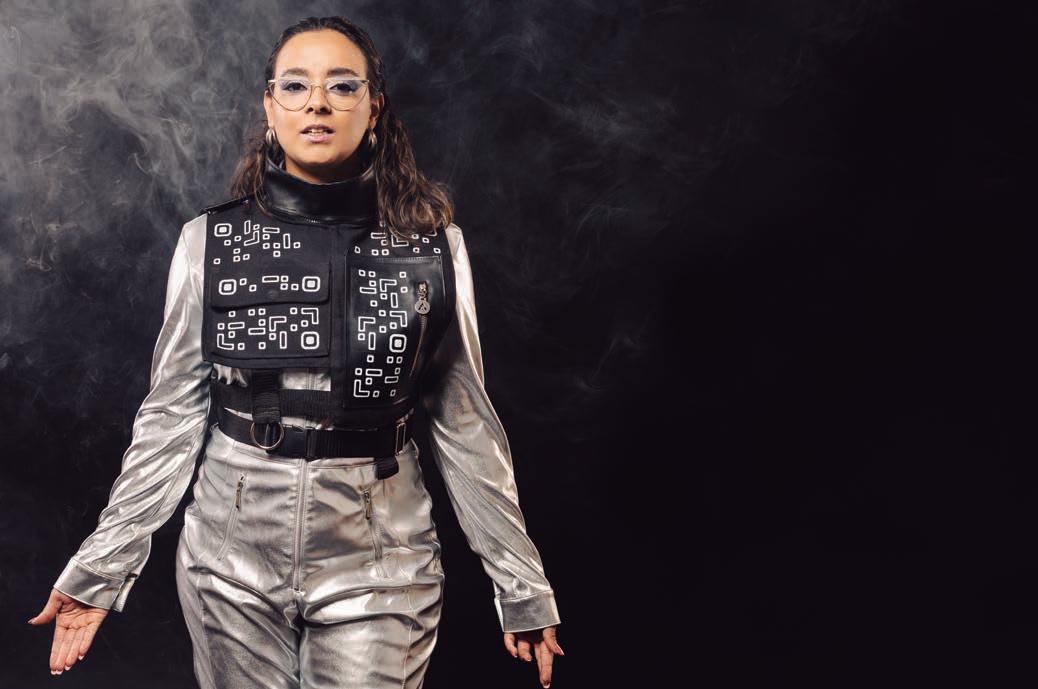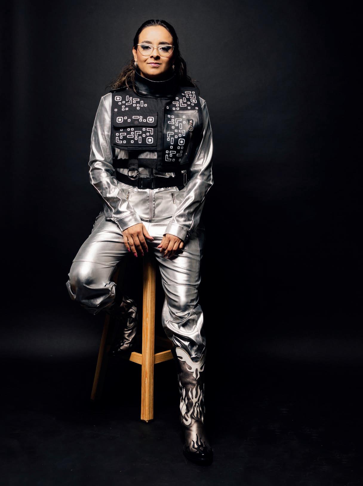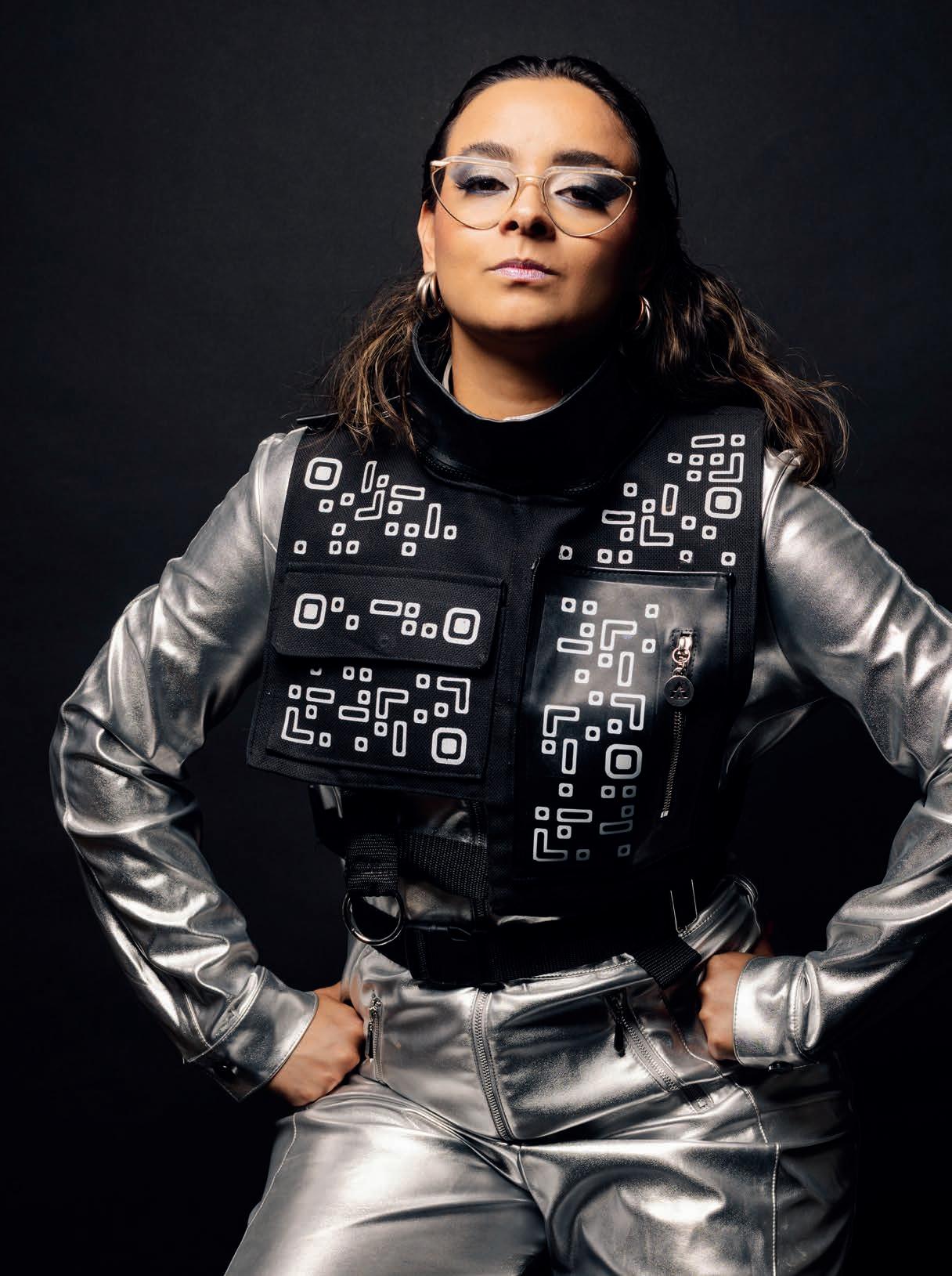 Nuestra protagonista llegó al estudio fotográfico de Jesús Cornejo un viernes de puente vacacional. Era ese día o nunca. Siempre tres pasos adelante, Ana abrió su maleta y nos sorprendió con un vestuario que puede adquirir Realidad Aumentada a través de las fotos que estás viendo en estas páginas. Nadia Tamez, fundadora y directora creativa de Synergy Studio (firma especializada en realidad extendida, arte y tecnologías interactivas, basada en Guadalajara, Jalisco), vistió a Ana Karen con el chaleco XR Fashion Experience, que fue presentado en las pasarelas del New York Fashion Week, inspirado en la idea de que todos somos un diamante en bruto; y eligió para ella las botas futuristas Bad Escorpiona.
