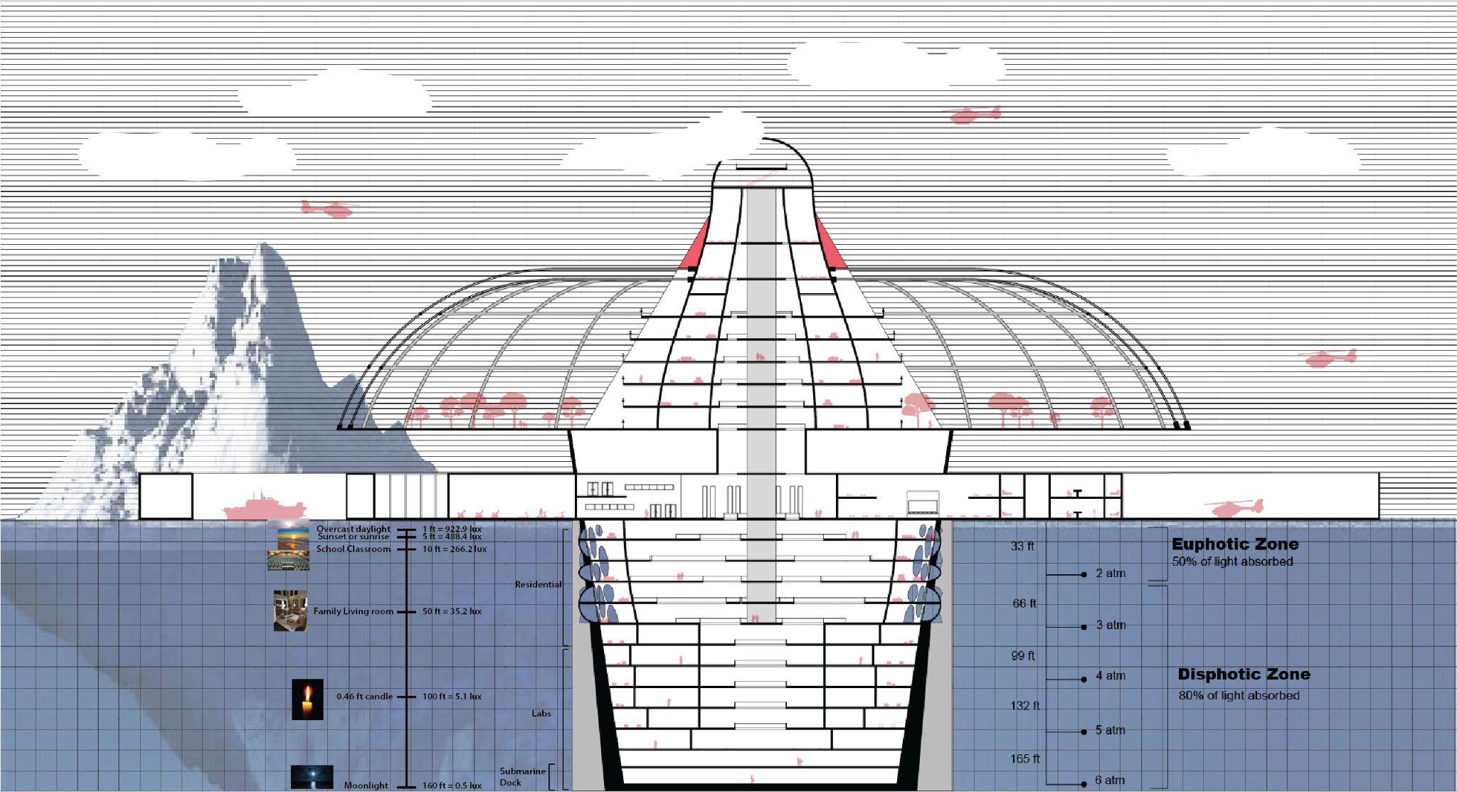 I wanted the Station to be a hub to accomodate activities, so there is an observation deck at the top, then the circulation transits into restaurants going downwards. After that, the circulation turns into the residential area located in the greenhouse. The first floor holds the search & rescue. Below sea level are more residential units and research labs. There are also measurements of water pressure and brightness shown to give a better sense of the level of depth.