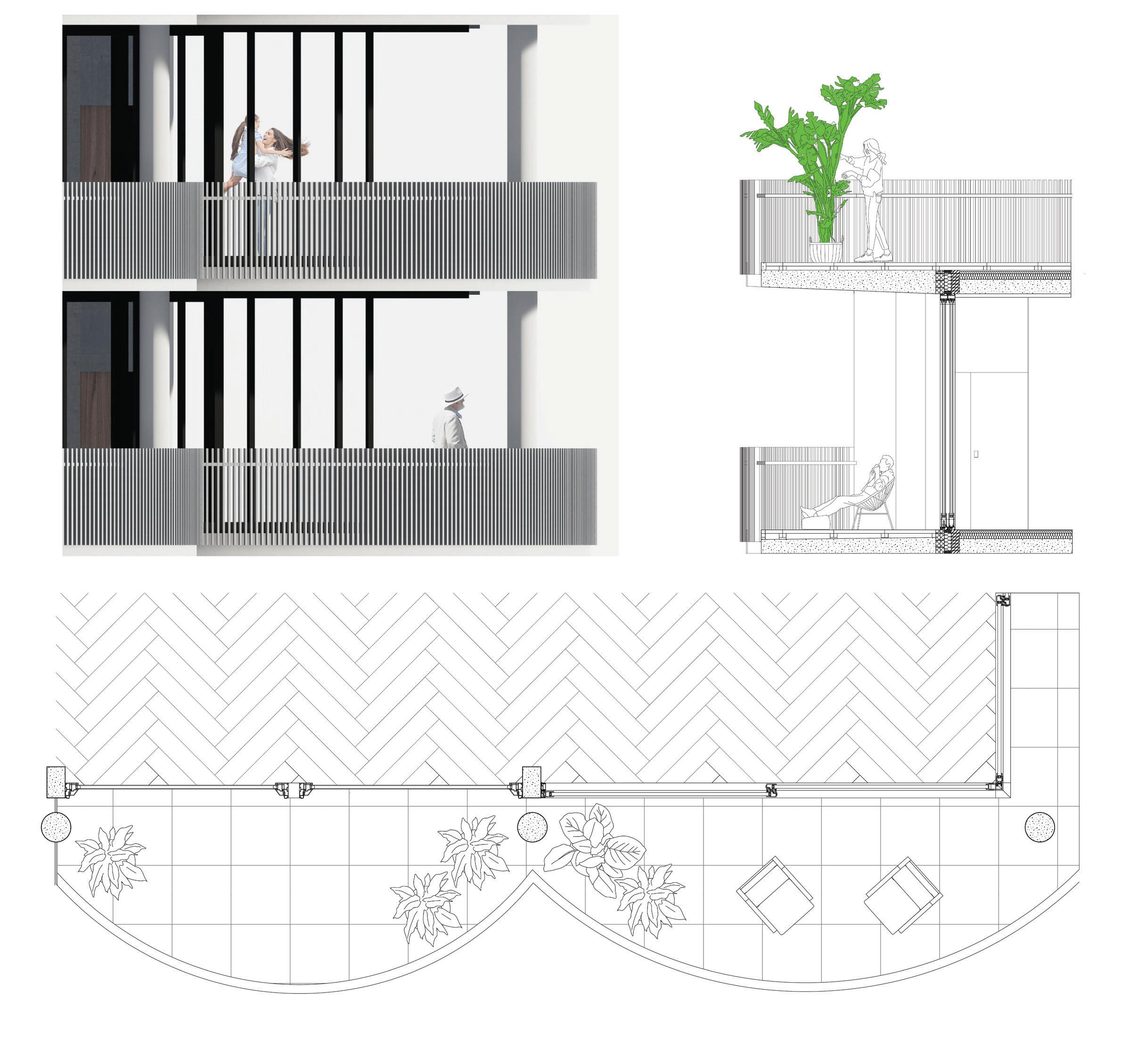The sliding glass doors on the corners can be opened during summer for ventilation while creating a loose-space between the balcony and the interior space, and closed during winter for insulation creating a corner space.