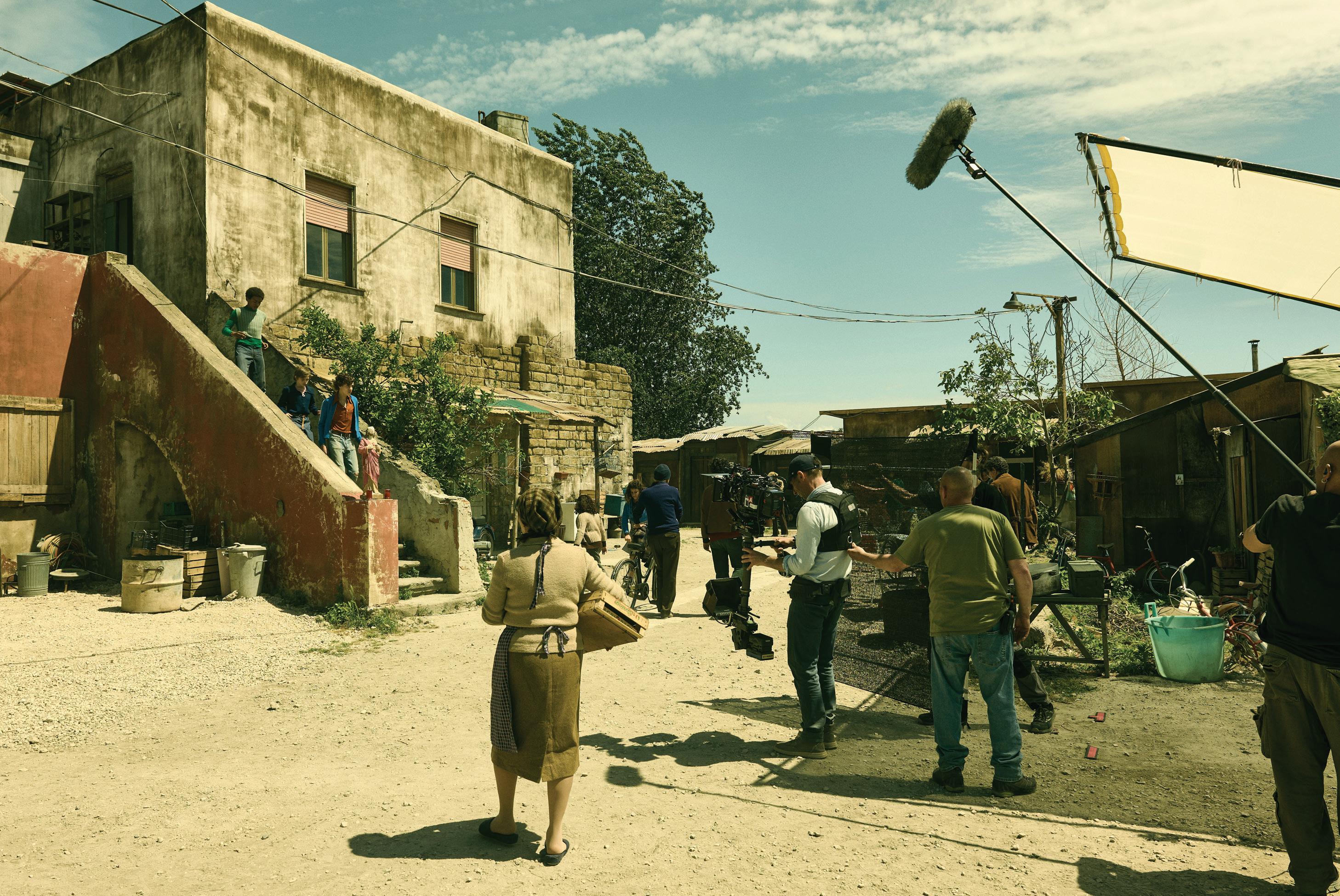 On the Gomorrah – Origins set in May this year, cast and crew are resetting between takes after taking over a patch of open farmland in Marianella, southeast of central Naples between the Mediterranean Sea and Mount Vesuvius. Beneath a large canopy, sheltering from the lunchtime sun, dozens of supporting artists sit and talk among themselves, each wearing period costume. Sheep and a donkey watch on from the adjacent fields that separate the set from a swathe of sand-coloured houses and apartment buildings.