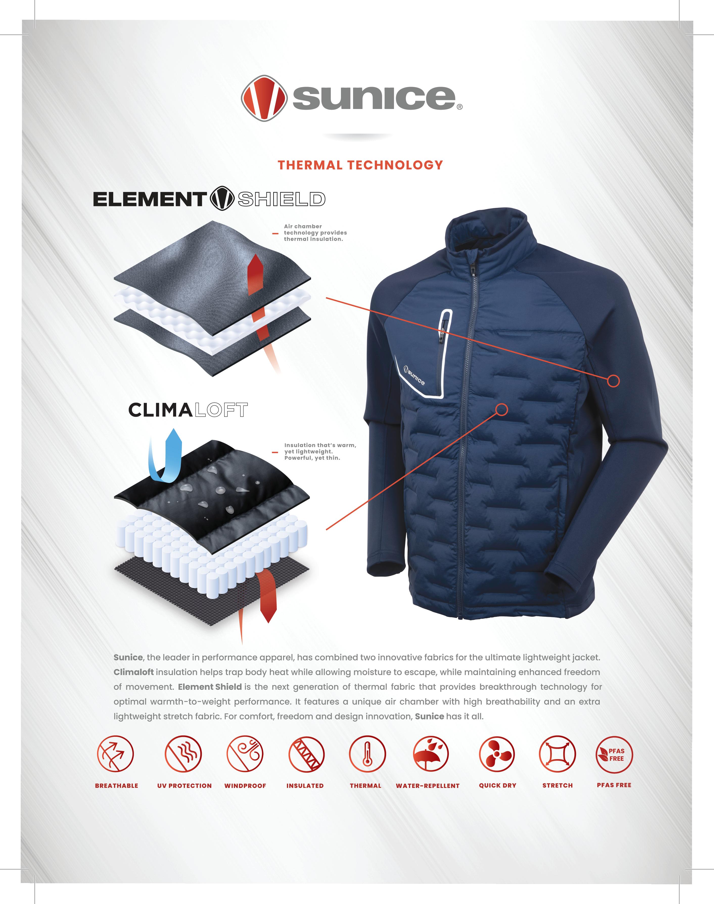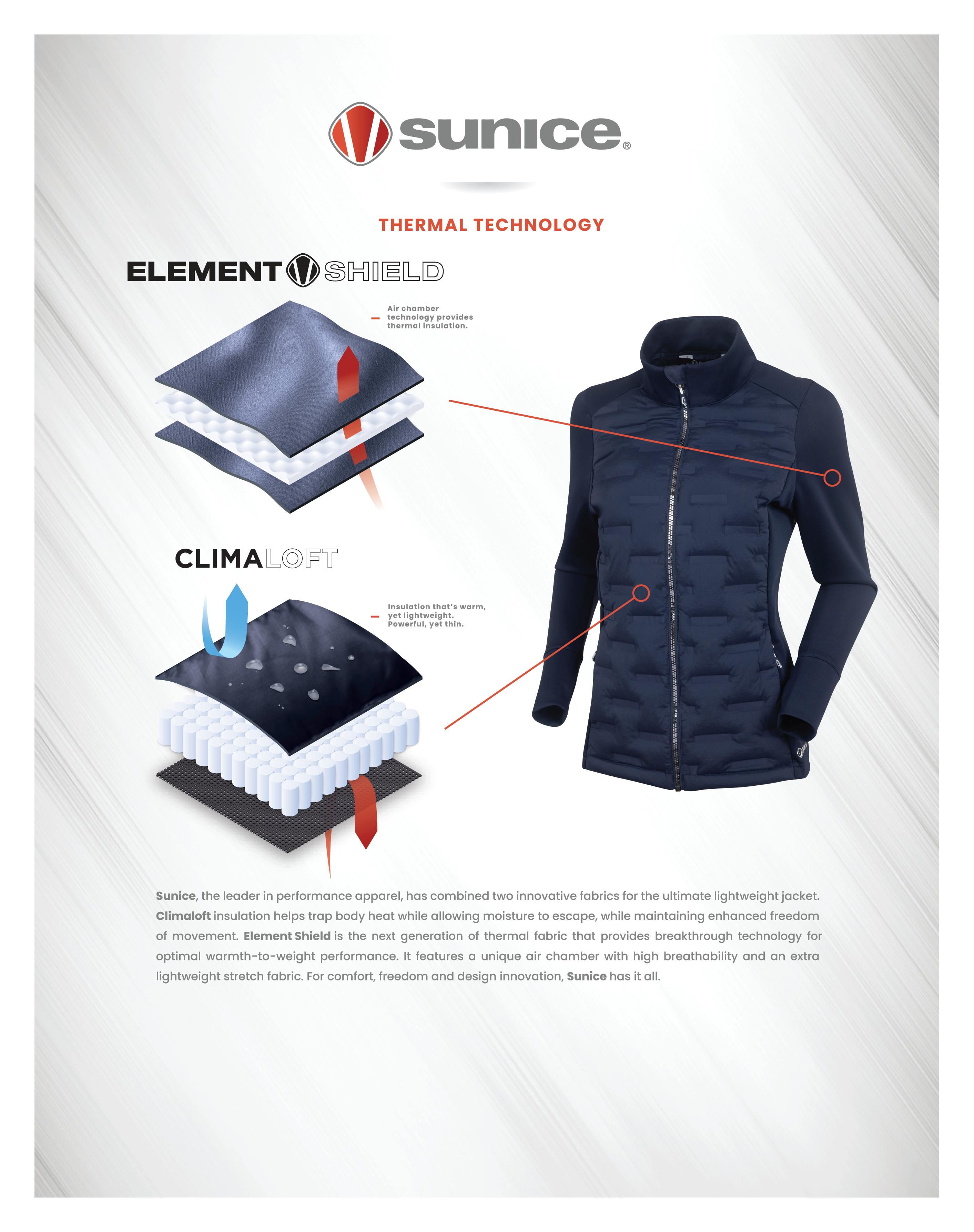 Sunice, the leader in sportswear technology and design, brings you Element Shield – a collection of fabrics geared toward providing the ultimate lightweight comfort. Ideal for layering and made of unique fabrics that control the micro climate between the body and garment, the Element Shield is the perfect addition to your activewear gear.
