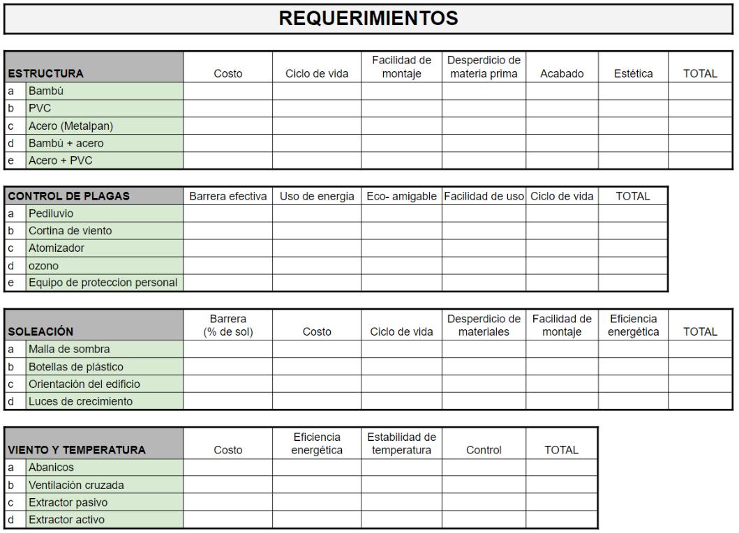 A partir de aquí desarrollamos los requerimientos y determinantes de nuestro proyecto, que fueron organizados en tablas para hacer la comparación numérica y tener bases para nuestras decisiones en cuanto a sistemas y materiales para el invernadero.
